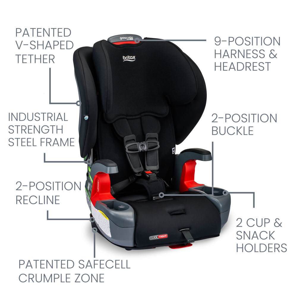 Escolha uma cadeirinha de carro infantil que cresça com seu filho com a cadeirinha de carro Britax Grow With YouTM ClickTightR arnês2booster Este assento elevatório com encosto alto começa como uma cadeirinha de carro com arnês de 5 pontos e se converte em um reforço de posicionamento do cinto que funciona com o cinto de segurança do seu carro Instale sempre com confiança Com a tecnologia ClickTight você sabe que está certo em 3 etapas fáceis: abrir e fechar a fivela Ajuste rapidamente o arnês de 9 posições e o apoio de cabeça usando apenas uma mão para o ajuste adequado