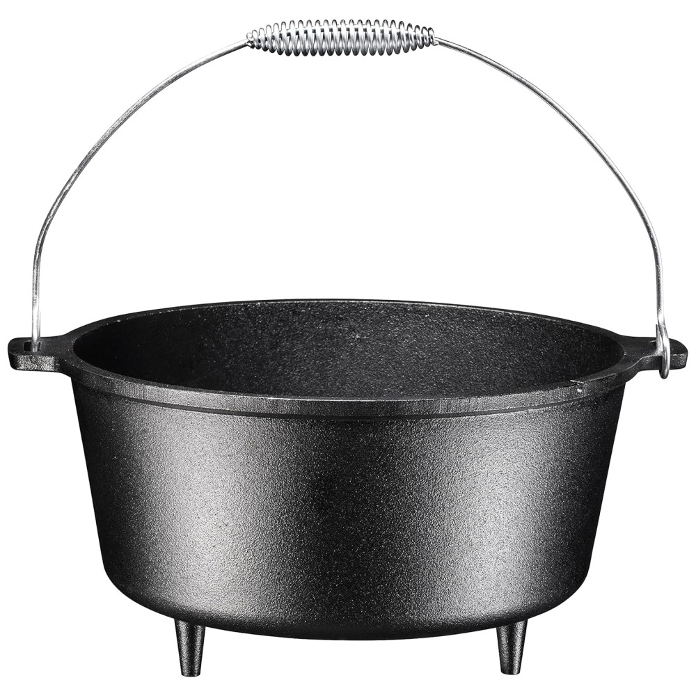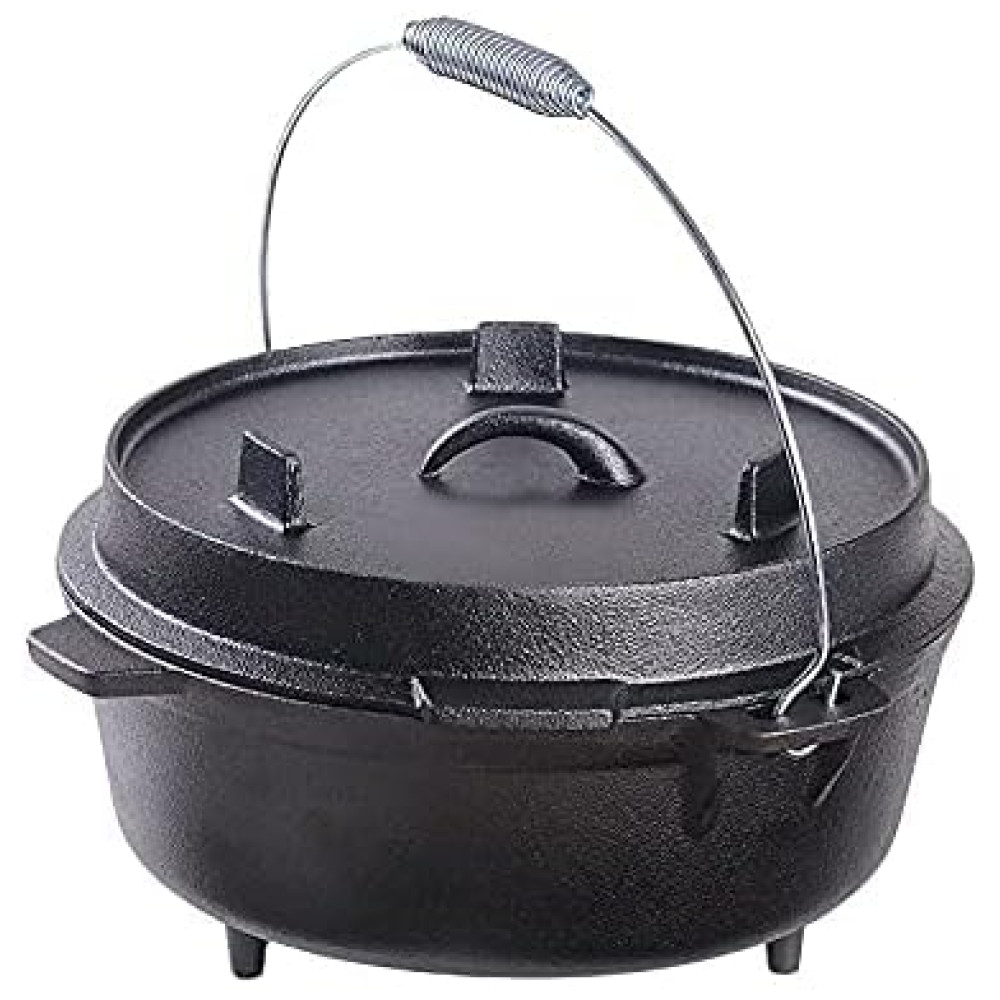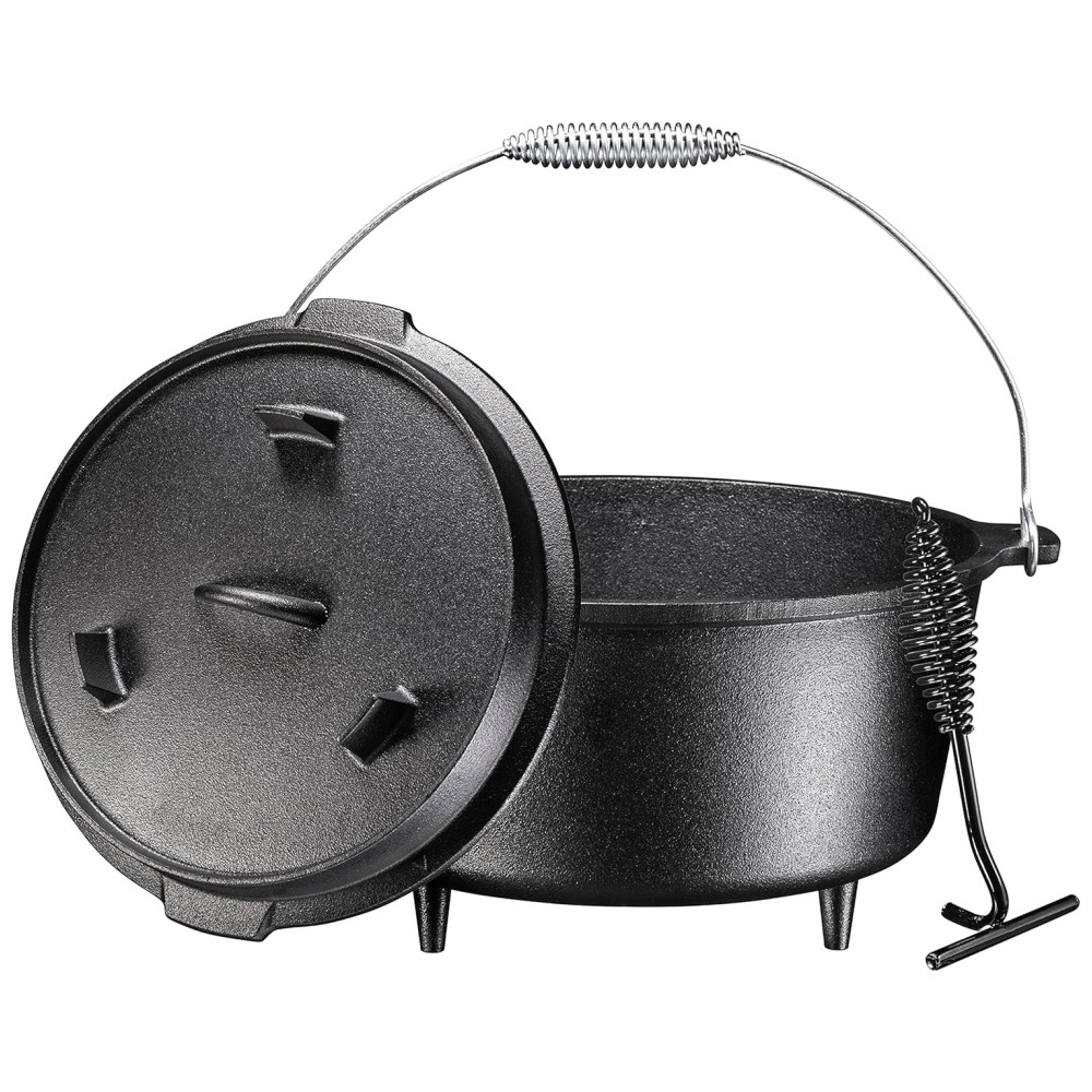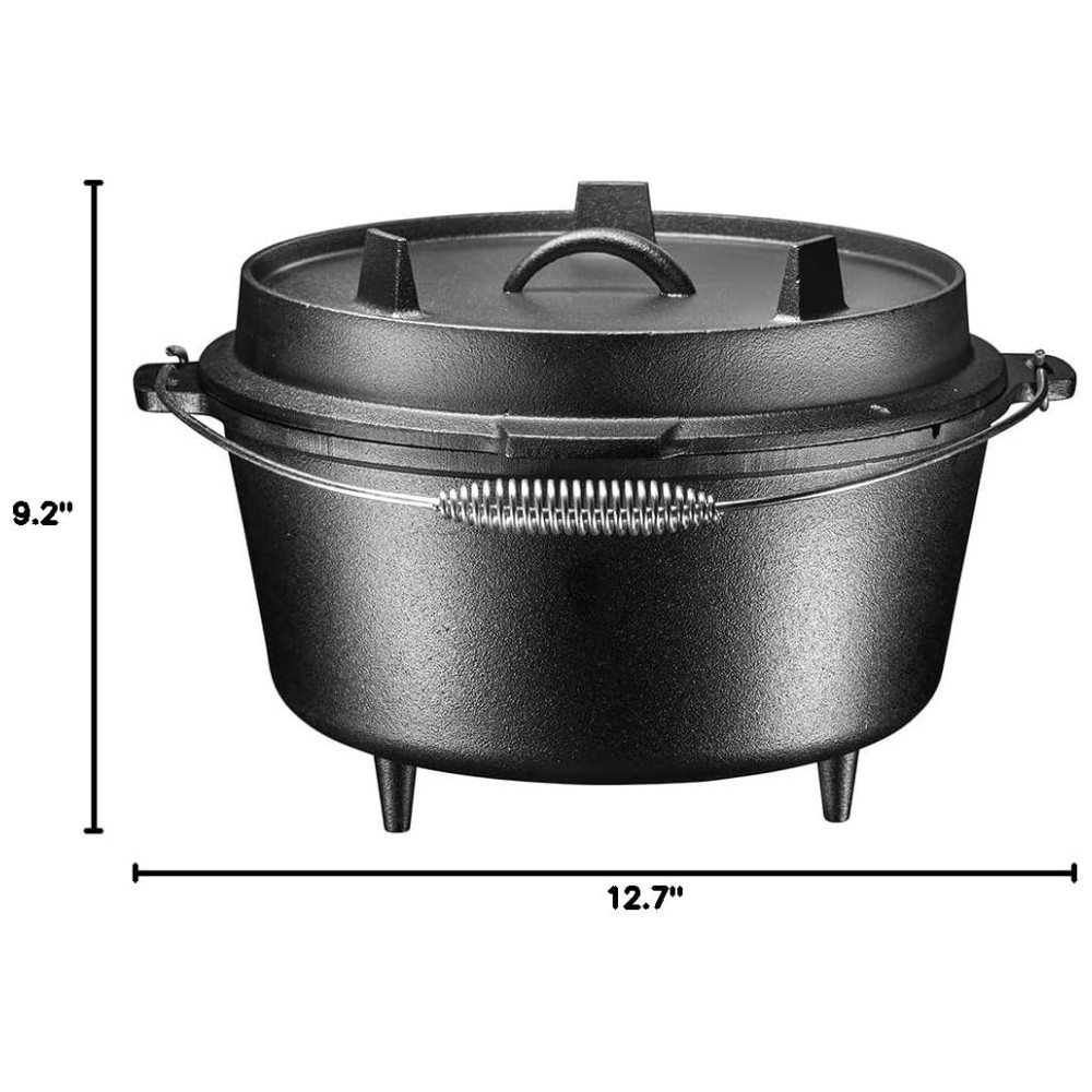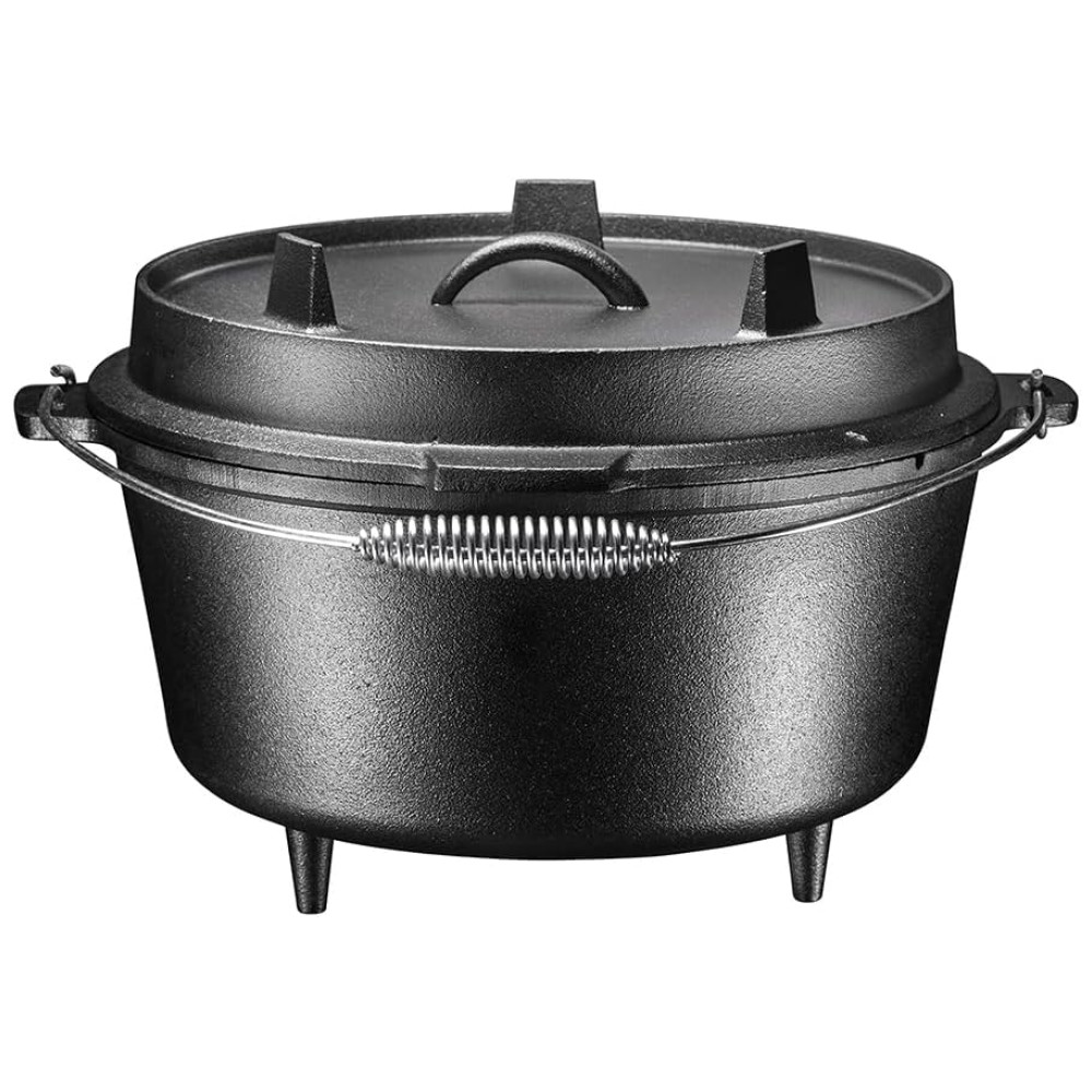 O forno holandês Bruntmor 8,5 quart de 3 pernas é uma parte essencial de qualquer cozinha ao ar livre Ferro fundido pré temperado de alta qualidade distribui uniformemente o calor mesmo quando em fogo aberto Tampa flangeada para colocar carvões em cima, Pode ser para cozinhar qualquer coisa de assados a bolos, biscoitos e pães Alça de metal na chaleira, Mantém os alimentos mais quentes do que panelas e frigideiras comuns, Tampa de ferro fundido pesado mantém os alimentos úmidos durante o cozimento Alça de alça conveniente na tampa, 3 pernas tornam este forno holandês ideal para fogo aberto ou cozimento a carvão, fácil de limpar
