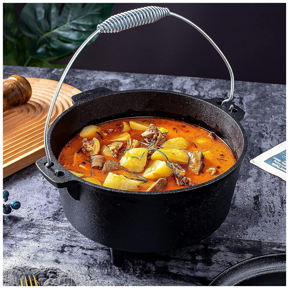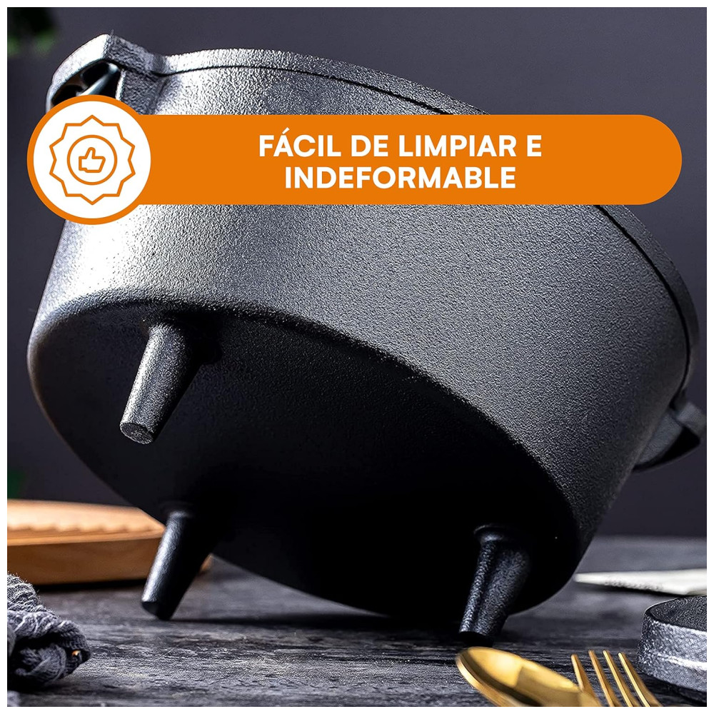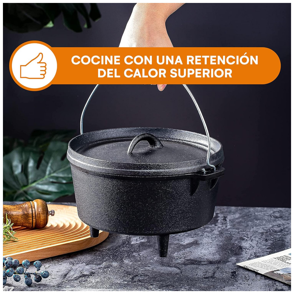 Cor 8,5 Quart Com 3 Pernas Cozinhar no forno holandês permite que você prepare as refeições mais saudáveis que só podem ser alcançadas com panelas de ferro fundido Use este forno holandês de 8,5 litros para suas receitas favoritas da família ou acampar. Esta peça de ferro fundido tem uma flange na tampa e três pernas, tornando a excelente para cozinhar com briquetes de carvão ou madeira. Coloque o forno holandês de três pernas sobre brasas ou fogo. Portátil e perfeito para todas as suas necessidades de camping. Cada peça das panelas de ferro fundido Bruntmor vem pré temperada com nosso Deep Seasoned Finish proporcionando uma superfície natural e de fácil liberação que está pronta para cozinhar. Faça ensopados, pães, sopas, sapateiro. Sele a carne e muito mais A tampa flangeada pode ser usada como uma frigideira, tornando a um incrível 2 em 1. Cuidados e Limpeza Limpe com água e detergente neutro