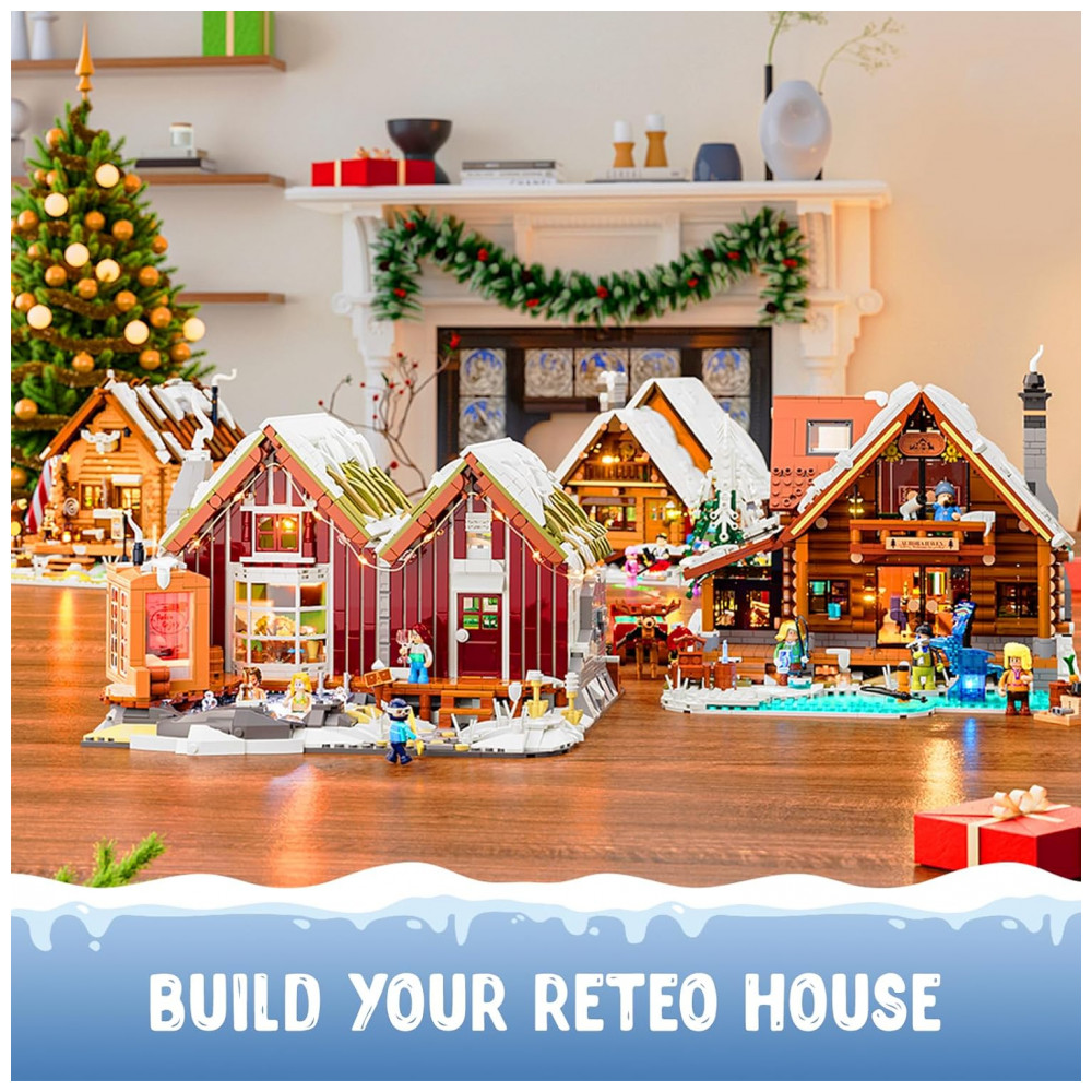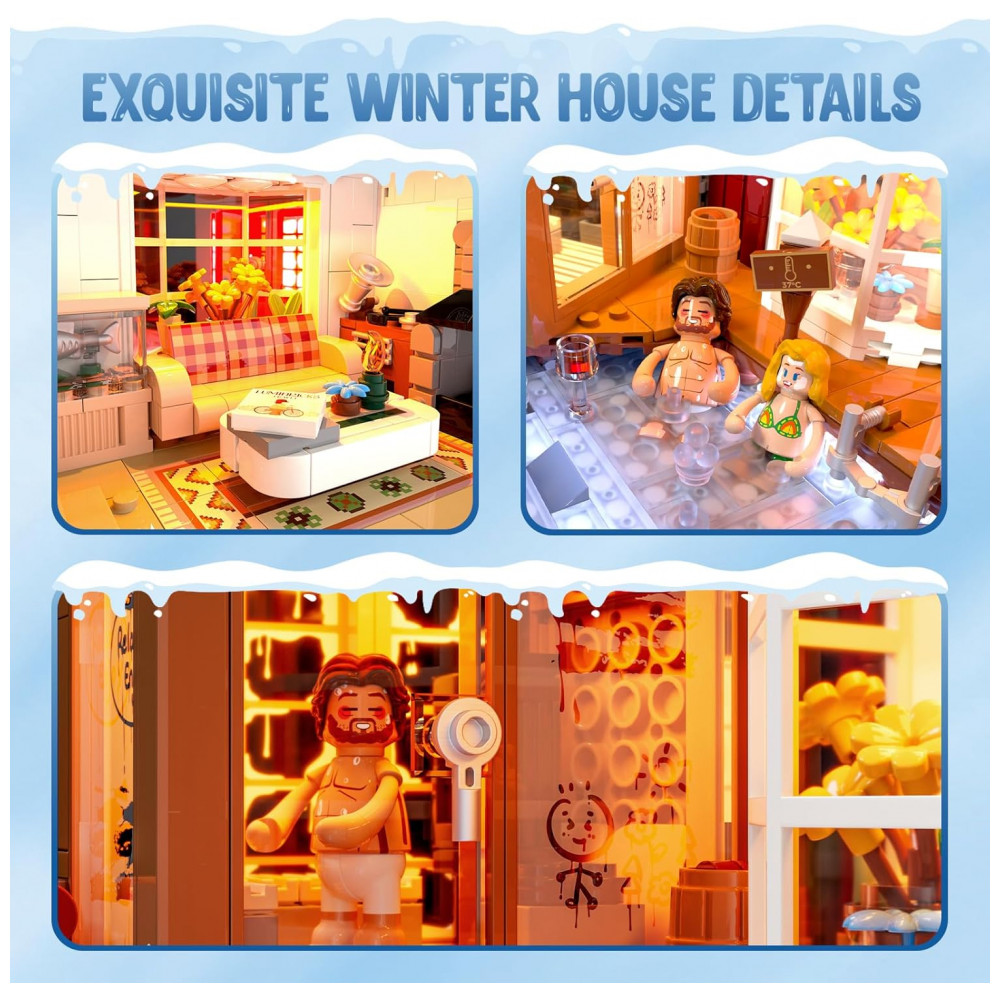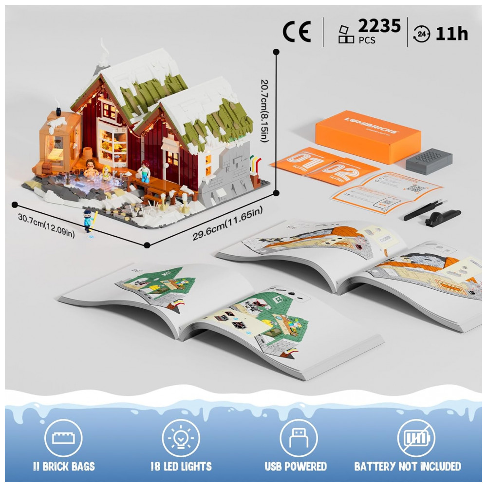 O kit Lumibricks Cabana Spa Inverno contém 2235 peças plásticas ABS inspiradas na arquitetura nórdica islandesa de casas de turfa e sobrados coloridos, recriando estrutura de fileira com fachadas frontal e traseira contrastantes separáveis para disposição lado a lado. O design modular permite exibição dupla: frente com atividades de spa e verso com cena de hóquei no gelo, otimizando visualização e narrativa criativa.