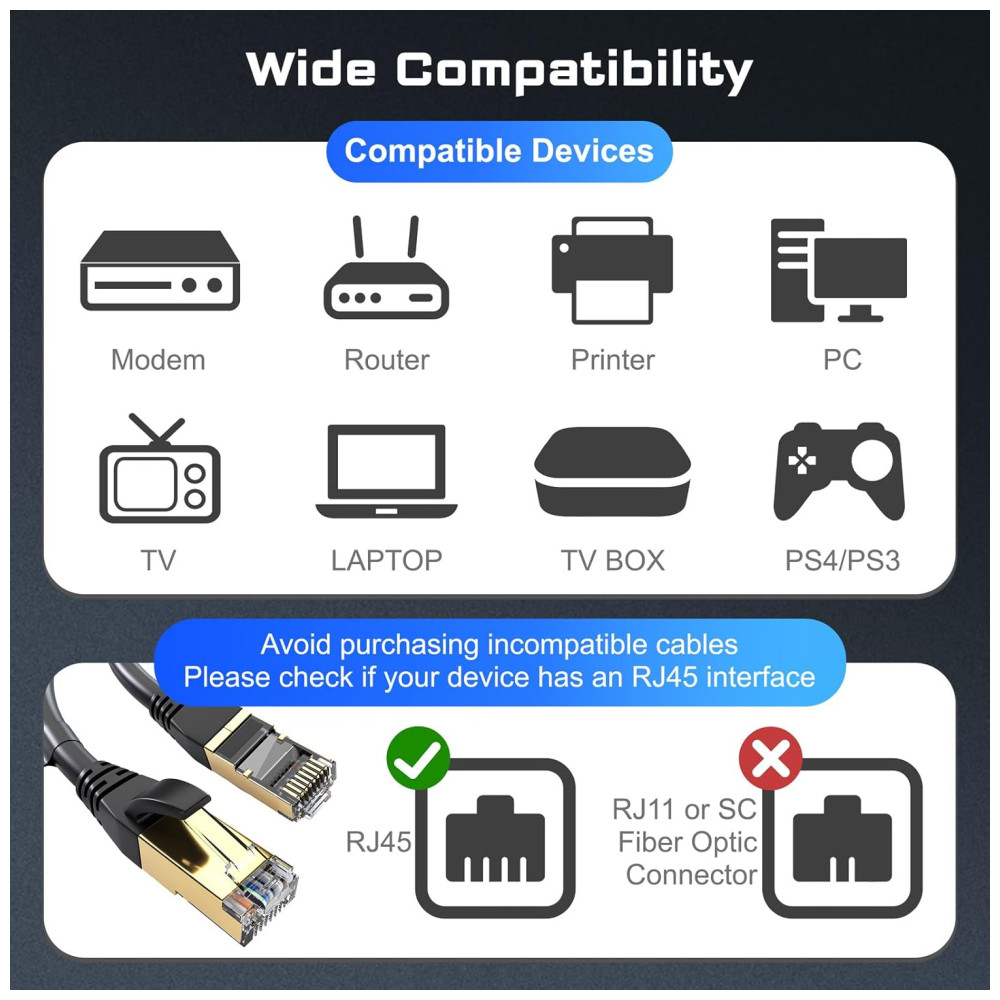 Conectores RJ5 e ampla compatibilidade dois conectores RJ4ados em ambas as funções do cabo Ethernet Cat85, com switch de rede, IP blind Cam, adaptadores, switch Nintendo ADSL, adaptadores, modem, PS3, PS4, X box, patch painel, servidores, impressoras Netgear, TP link, telefones VoIP, laptop, adaptador NAS, hubs, tomada Keystone, Smart TVmac e outros com RJ45. Também compatível com Cat7 , Cat5 , Cat5e , Cat6 , Cat6e.