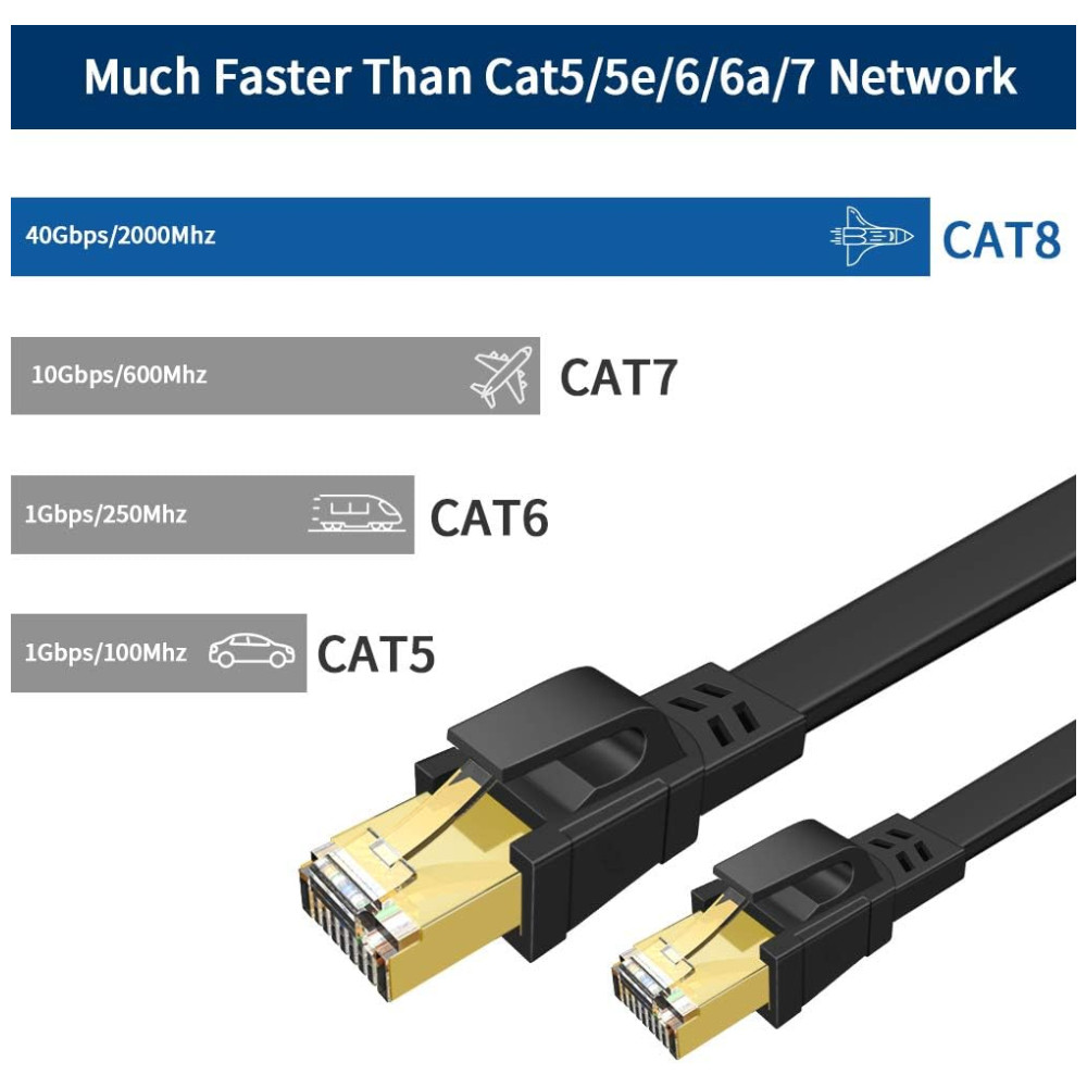 Compatibilidade universal Com dois conectores RJ45 blindados em dispositivos, o cabo de internet com modem, PS4, PS5, computador, notebook, caixa de TV, impressoras de TV, ADSL, NAS, telefones VoIP e mais. Mola dura e sem protância em ambas as portas que podem conectar ou cabo facilmente. O cabo Ethernet plano Cat 8 é compatível com o modelo antigo cabo Ethernet Cat7 , Cat6 , Cat5 , Cat5e