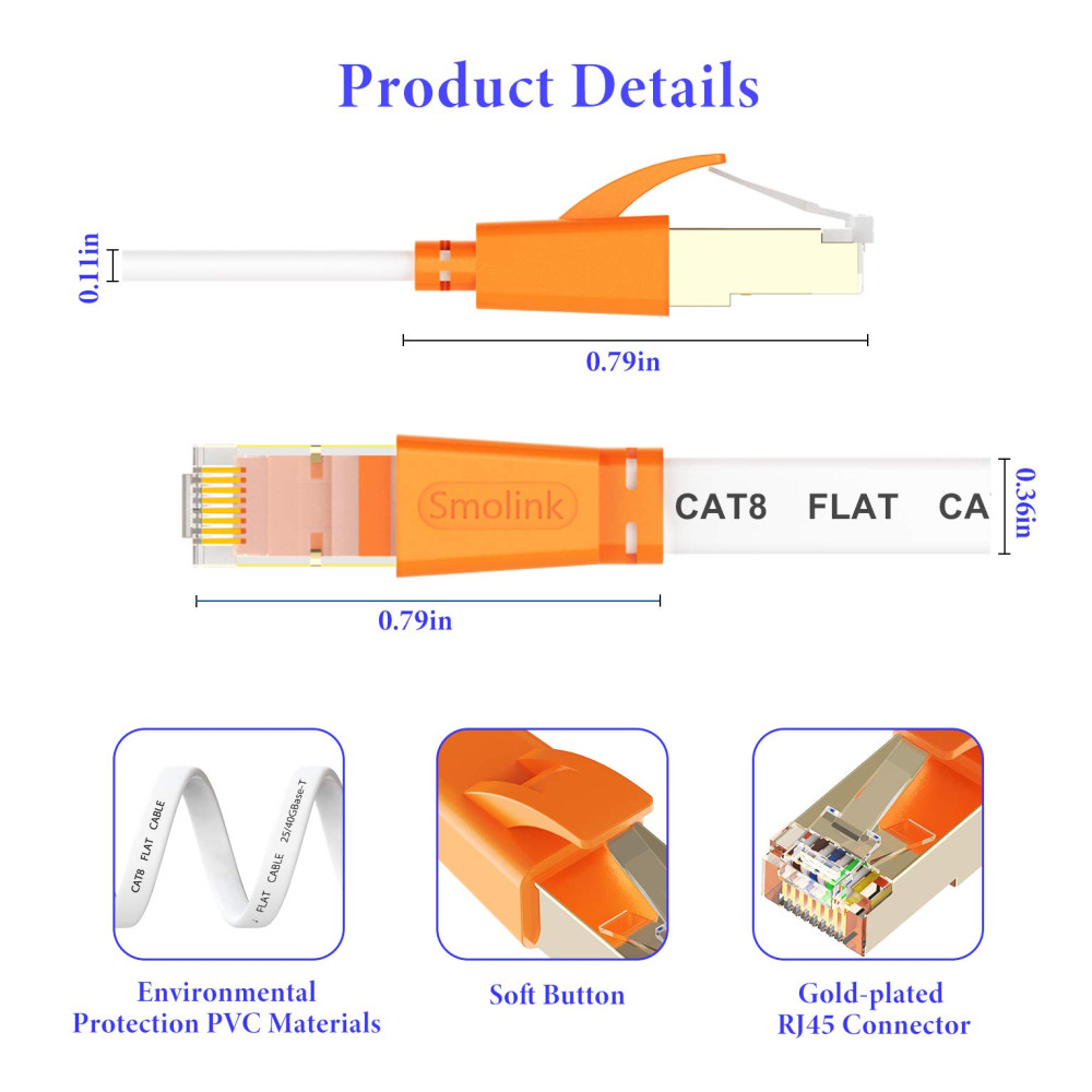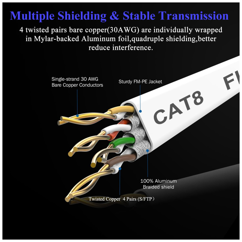 Desempenho Estável Superior Composto por 100 de cobre livre de oxigênio no interior, 4 pares 100 30WAG puro e par trançado protegido STP de fios de cobre com 50 pinos de contato banhados a ouro mícron em cada conector RJ45 protegido, o cabo Ethernet Cat8 oferece proteção rápida contra interferência EMI, fidelidade RFI e confiabilidade para transmissão de dados de longa duração.