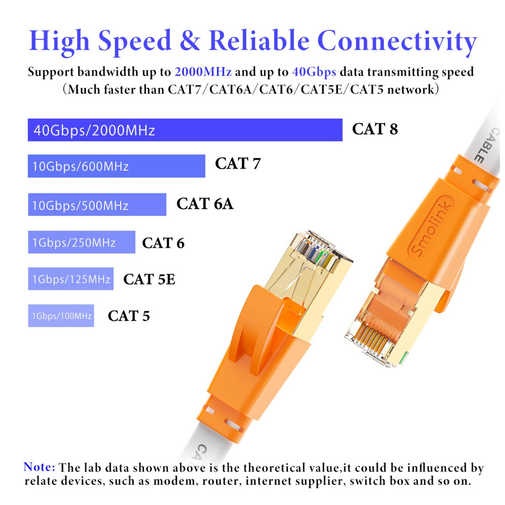 Hiper velocidade de 40 Gbps O cabo Ethernet Cat8 fornece até 2.000 MHz, para 25BASE T e velocidade de dados de até 40 Gigabits por segundo para redes domésticas e de escritório com fio, conectado aos segmentos LAN, WAN e equipamentos de rede em hiper velocidade e permite que você faça stream de música em HD, na internet, jogue sem se preocupar com vídeos.