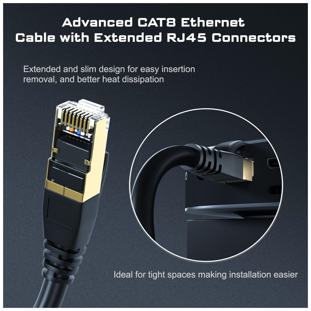 Conectores RJ45 e ampla compatibilidade Com dois conectores RJ45 blindados em ambas as extremidades, o cabo Ethernet Cat8 funciona perfeitamente com qualquer dispositivo que possua conectores RJ45,