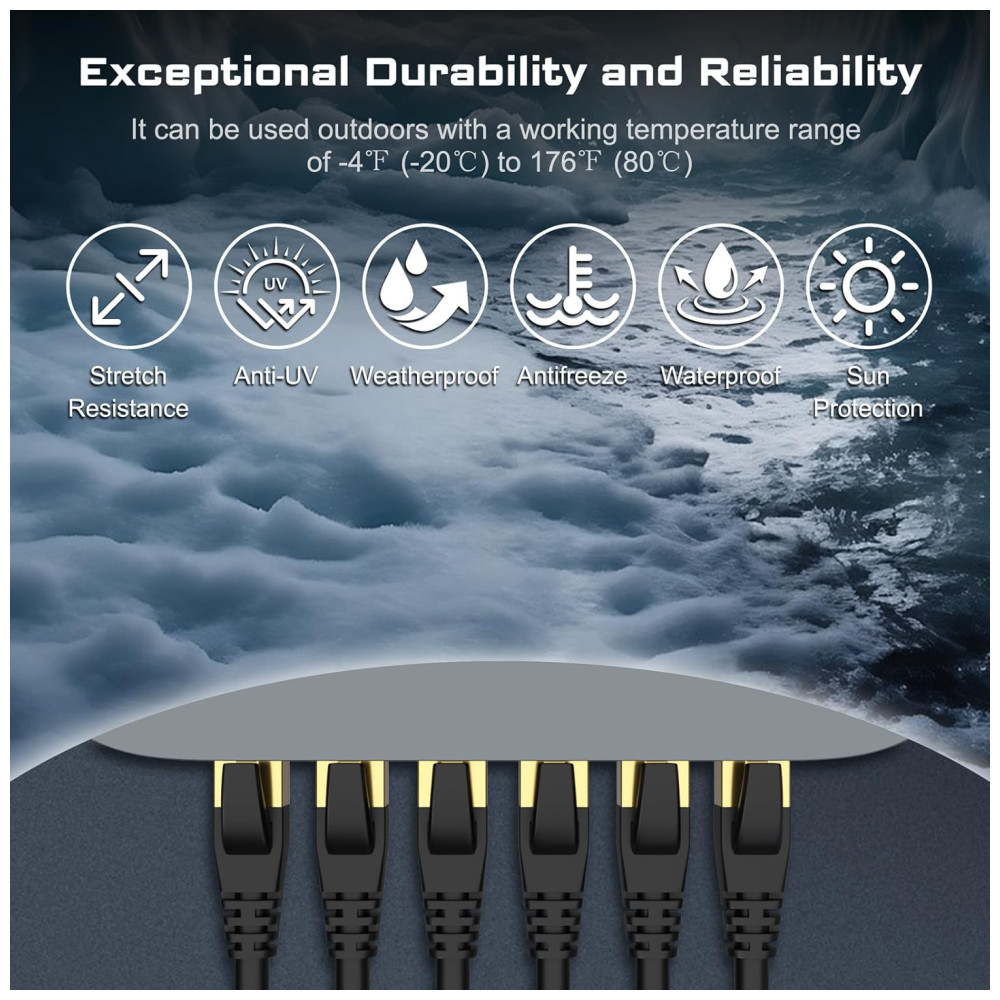 À prova de intempéries e UV Resistente Cabo RJ45 blindado com revestimento de PVC resistente a UV de alta qualidade, Cat8 pode suportar luz solar direta e condições climáticas extremas, mas ainda assim funcionando de forma eficiente. O cabo Ethernet Cat8 classificado para uso externo é à prova dágua e antienvelhecimento. Design premium com grande qualidade