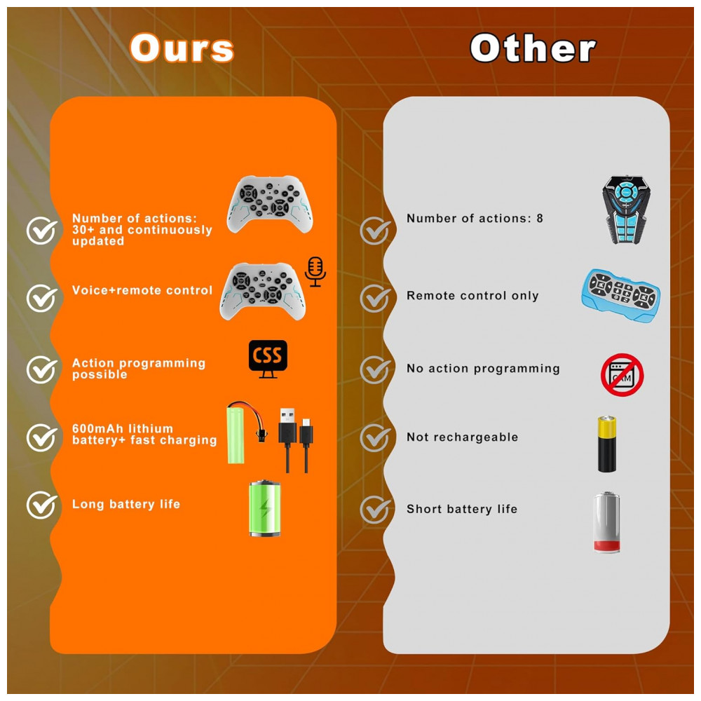 O produto oferece modo de programação simples, no qual é possível montar sequências de ações, contribuindo para desenvolver raciocínio lógico e introduzir conceitos básicos de programação em crianças na faixa de 6 a 12 anos. O controle do robô é feito por comandos de voz em inglês e por controle remoto, permitindo acionar funções de movimento, uso da garra e acrobacias de forma direta.