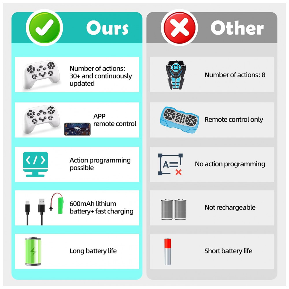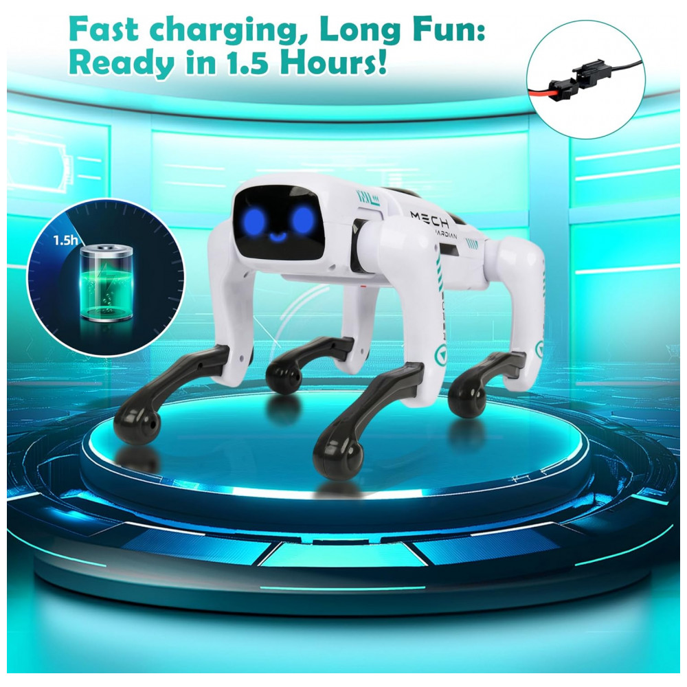 A carcaça é construída em plástico ABS não tóxico, com superfícies lisas e cantos arredondados, voltada para uso infantil. O sistema de proteção com desligamento automático ajuda a preservar os motores em caso de colisões ou bloqueios mecânicos. O conjunto é adequado para brincadeiras individuais ou em família, funcionando como introdução a conceitos de robótica e programação aplicada a um pet robótico.