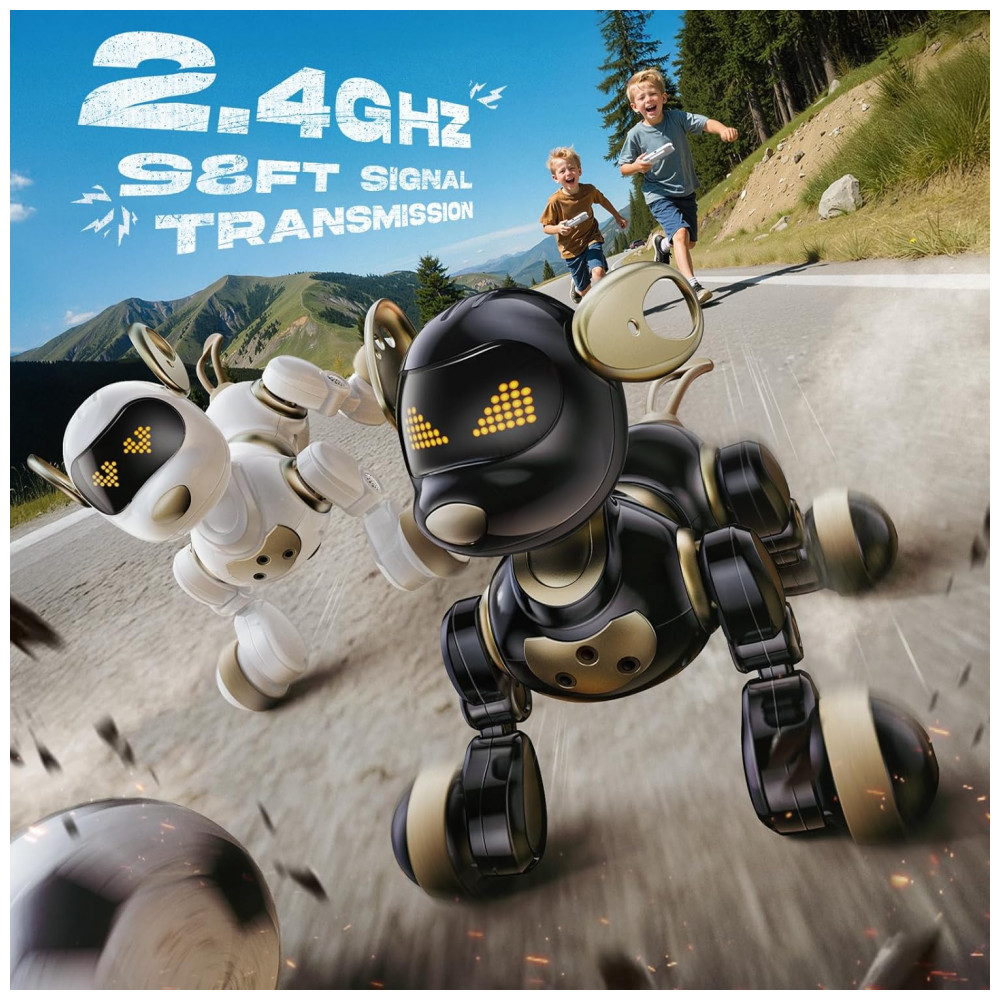 Cachorro robô inteligente Ruko 18011 preto e dourado com 30+ faces em LED controle remoto 24GHz gestos e programação para criança