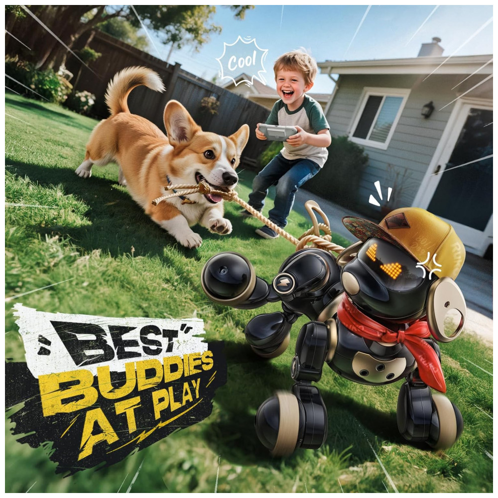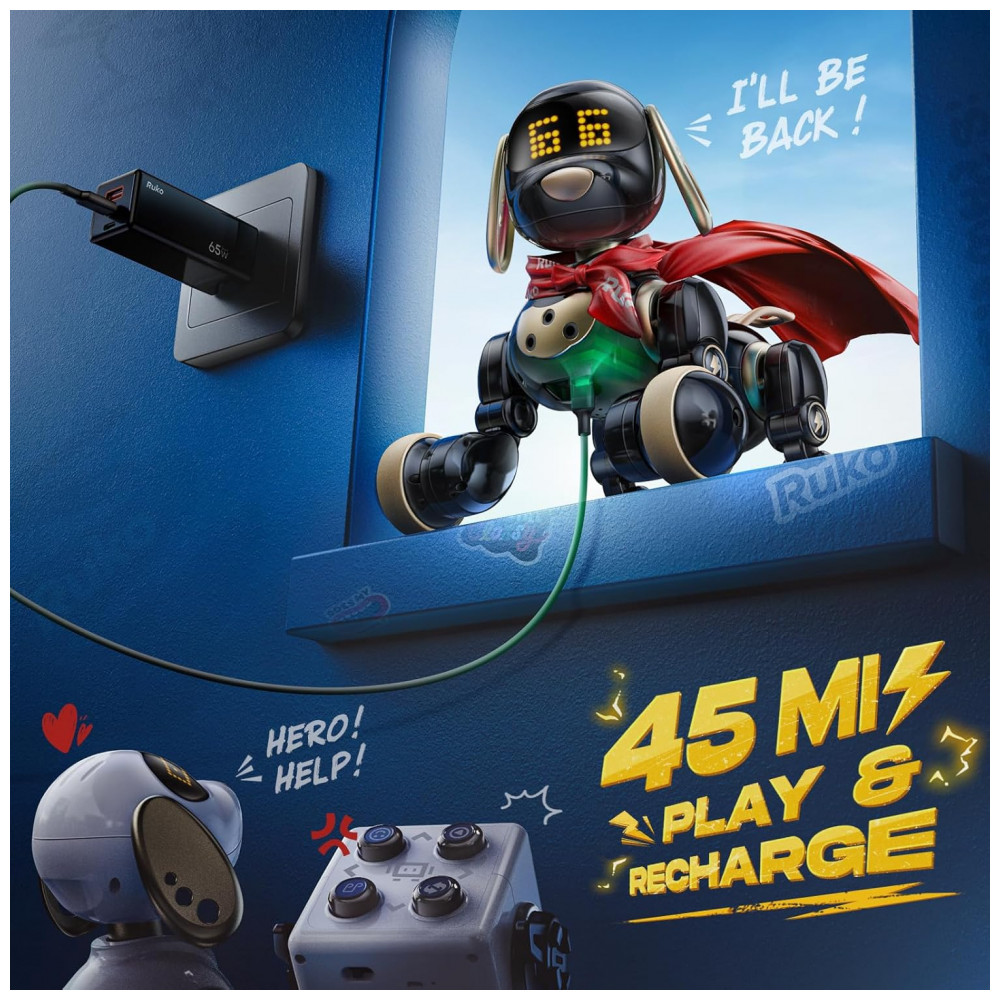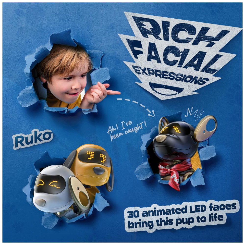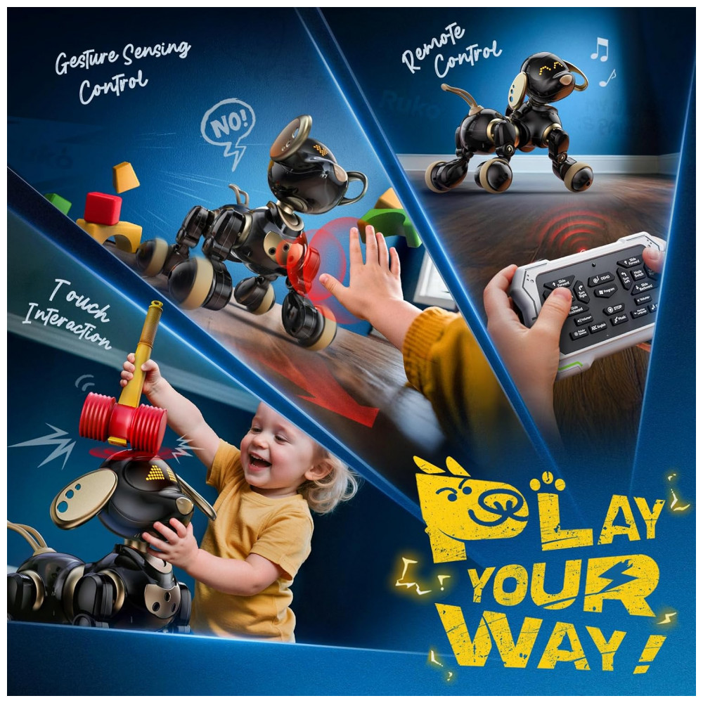 O cachorro robô Ruko 18011 preto e dourado é um brinquedo eletrônico interativo indicado para crianças a partir de 3 anos, capaz de caminhar, girar, deslizar, abanar o rabo, dançar e executar movimentos temáticos como levantar a pata para simular que está fazendo xixi. Ele responde ao toque na cabeça com sons e gestos pré-programados, utiliza controle remoto em 2,4GHz com alcance de até cerca de 30 m e permite também controle por gestos, com sensores que ajudam a desviar de obstáculos em ambientes internos.