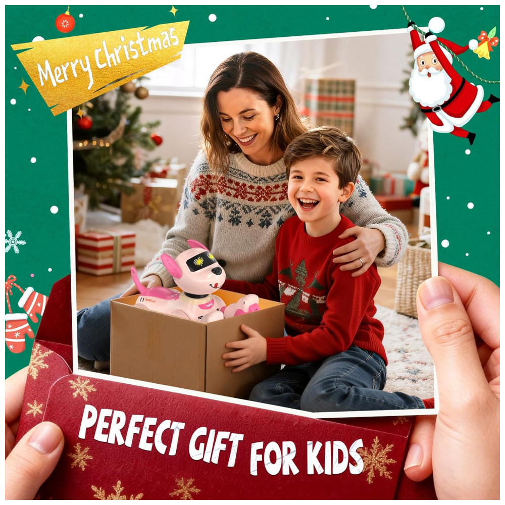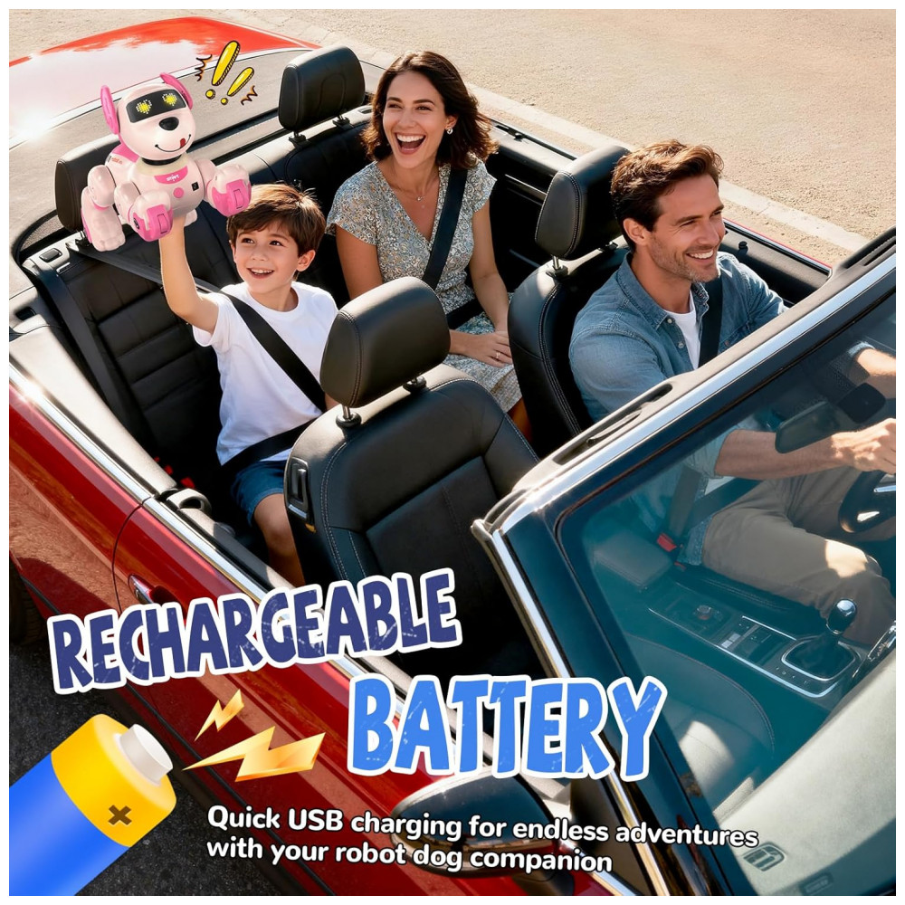 O cachorro robô Anysun rosa é um pet eletrônico programável com controle remoto, indicado para crianças a partir de 8 anos, que combina três modos de interação: controle remoto, comandos de voz em inglês e sensores de toque no corpo. O brinquedo aceita comandos direcionais e aciona reações “fofas” ao toque, simulando respostas de um cão de estimação em ambiente interno.