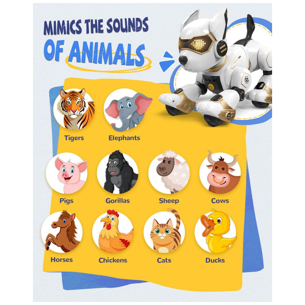 O modo de programação permite combinar comportamentos como flexões, demonstração automática, movimentos de ioga, danças acrobáticas, contar histórias, fazer parada de mãos, imitar gestos de carinho e andar para frente, para trás e virar para os lados. O robô também imita sons de dez animais, incluindo elefante, gato, pato, porco, gorila, tigre, ovelha, vaca, cavalo e galinha, ampliando a variedade de respostas sonoras durante a brincadeira. As funções de dança e canto incorporam músicas e coreografias voltadas ao público infantil, acionadas por botões dedicados no controle remoto.