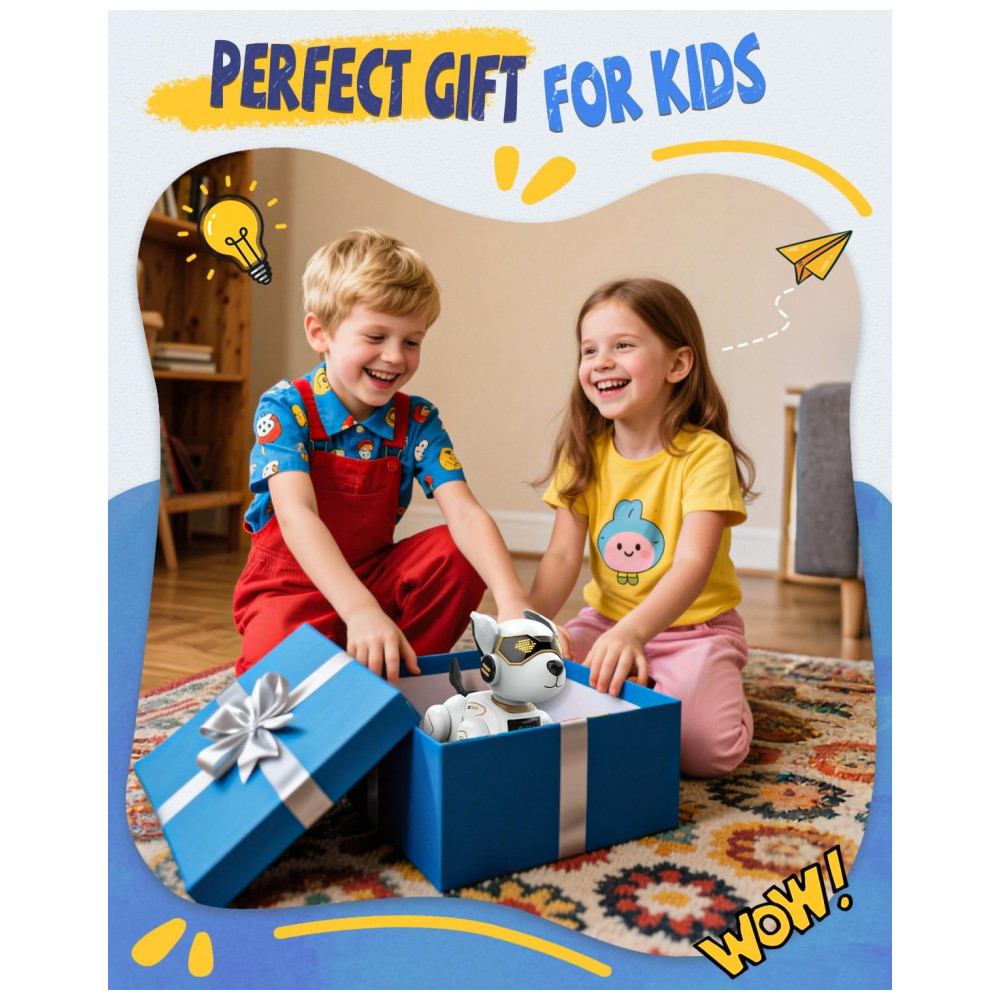 O cachorro robô R27 dourado é um pet eletrônico programável com controle remoto, indicado para crianças a partir de 6 anos, que integra sensores de voz, toque e gestos para diferentes formas de interação. O brinquedo pode ser controlado pelo controle remoto, por toques em áreas sensíveis do corpo e por comandos de voz, permitindo deslocamentos em várias direções e ativação de movimentos predefinidos. A proposta inclui programação simples de sequências de ações, ajudando a introduzir conceitos básicos de lógica e sequência de comandos.