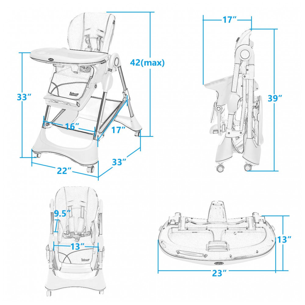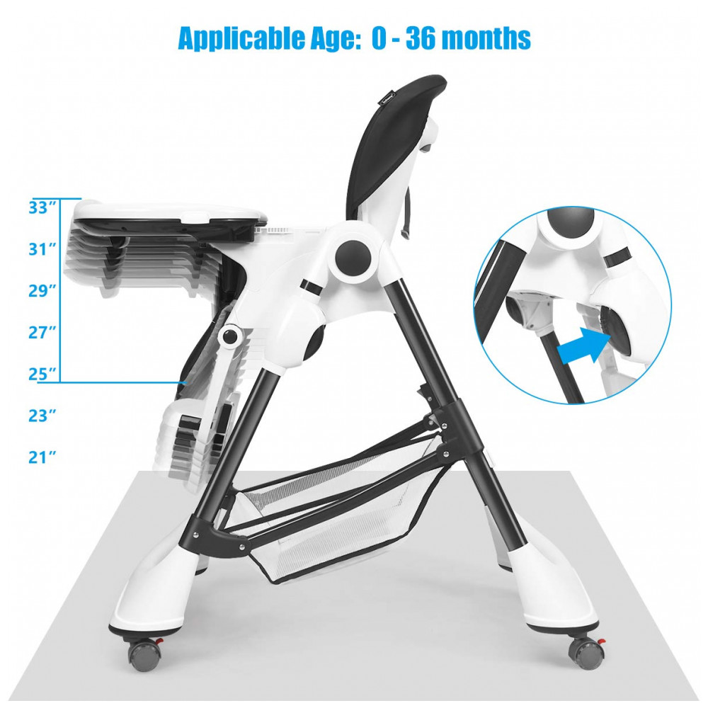 AJUSTE MULTIFUNCIONAL A cadeira alta para bebês pode atender a todas as suas necessidades. A altura do assento é ajustável com 7 posições para corresponder a diferentes alturas das mesas. O encosto de 3 posições oferece o espaço mais confortável com o crescimento do seu bebê. O apoio para os pés de 3 posições para atender às diferentes posturas do bebê. O comprimento do apoio para os pés tem 3 níveis para obter a posição mais confortável para as pernas do bebê. As bandejas de 3 posições para bebês de diferentes idades para comer ou brincar de recém nascido a criança.