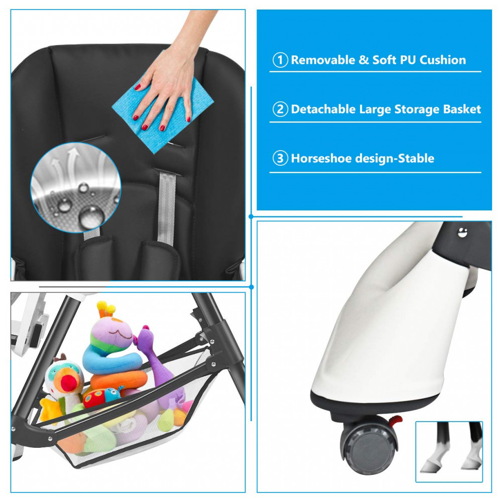 CONVENIENTE DE LIMPAR Você sempre tem problemas com a limpeza A cadeira alta INFANS ajudou as mães a resolver este problema. A cadeira contém bandejas duplas destacáveis. A bandeja superior pode ser lavada na lava louças e pode ser usada para alimentar ou comer bebês. A bandeja inferior é a área de recreação onde os bebês podem se divertir brincando. A capa de almofada de PU removível e impermeável é fácil de limpar e evita o acúmulo de poeira