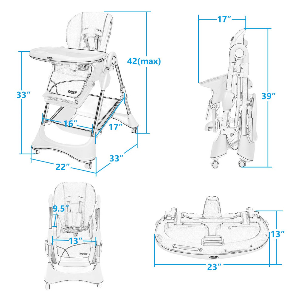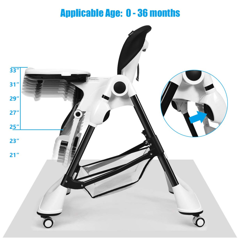 AJUSTE MULTIFUNCIONAL A cadeira alta para bebês pode atender a todas as suas necessidades. A altura do assento é ajustável com 7 posições para corresponder a diferentes alturas das mesas. O encosto de 3 posições oferece o espaço mais confortável com o crescimento do seu bebê. O apoio para os pés de 3 posições para atender às diferentes posturas do bebê. O comprimento do apoio para os pés tem 3 níveis para obter a posição mais confortável para as pernas do bebê. As bandejas de 3 posições para bebês de diferentes idades para comer ou brincar de recém nascido a criança.