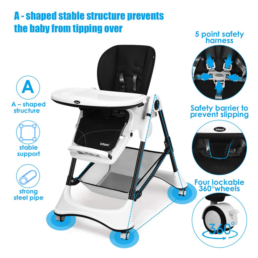 Cadeira de Alimentação Cadeirão com 4 Rodas Trancáveis e Cesta de zenamento INFANS Preto