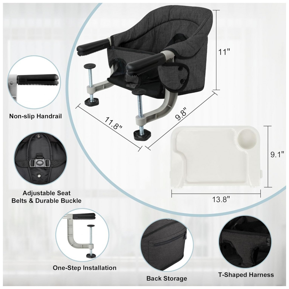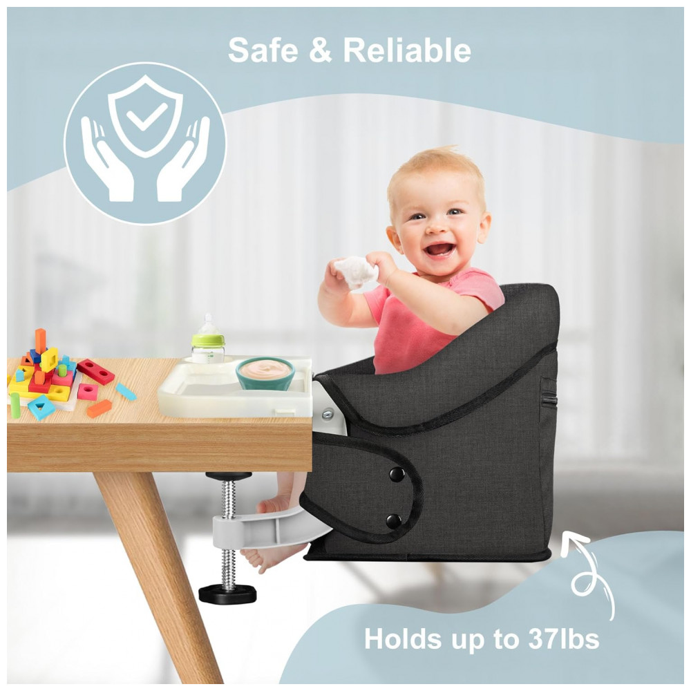 CADEIRA ALTA DE MESA PORTÁTIL Este gancho na cadeira alta possui cinto de segurança ajustável em dois lados e arnês em forma de T na frente para ficar no assento, segurando bebê e criança entre 6 e 36 meses até 16 kg que podem sentar se eretos sem qualquer ajuda. Estrutura metálica em forma de D para reforço que proporciona estabilidade. O grande gancho de braçadeira antiderrapante faz com que ele se encaixe firmemente na mesa e não danifique ou arranhe a superfície das mesas.