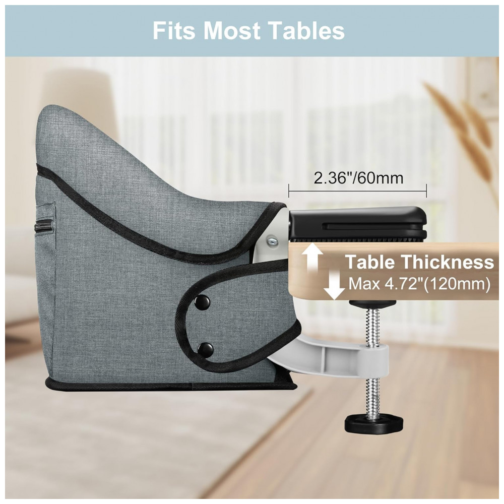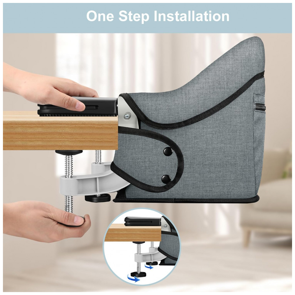 MONTAGEM E DESMONTAGEM RÁPIDA Instalação rápida e desmontagem em apenas 20s sem ferramentas para jantar em casa e em movimento, e a tampa do assento removível também pode ser limpa facilmente. Esta cadeira alta rápida é compatível com as mesas de jantar e bancadas mais pesadas e resistentes de 2 a de espessura. Dicas Meça primeiro a borda da mesa.
