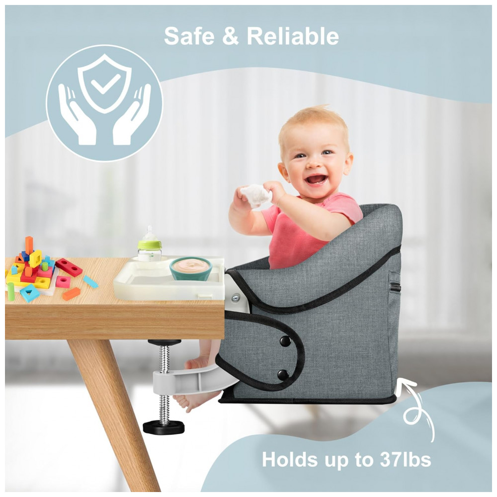 CADEIRA ALTA DE MESA PORTÁTIL Este gancho na cadeira alta possui cinto de segurança ajustável em dois lados e arnês em forma de T na frente para ficar no assento, segurando bebê e criança entre 6 e 36 meses até 16 kg que podem sentar se eretos sem qualquer ajuda. Estrutura metálica em forma de D para reforço que proporciona estabilidade. O grande gancho de braçadeira antiderrapante faz com que ele se encaixe firmemente na mesa e não danifique ou arranhe a superfície das mesas.