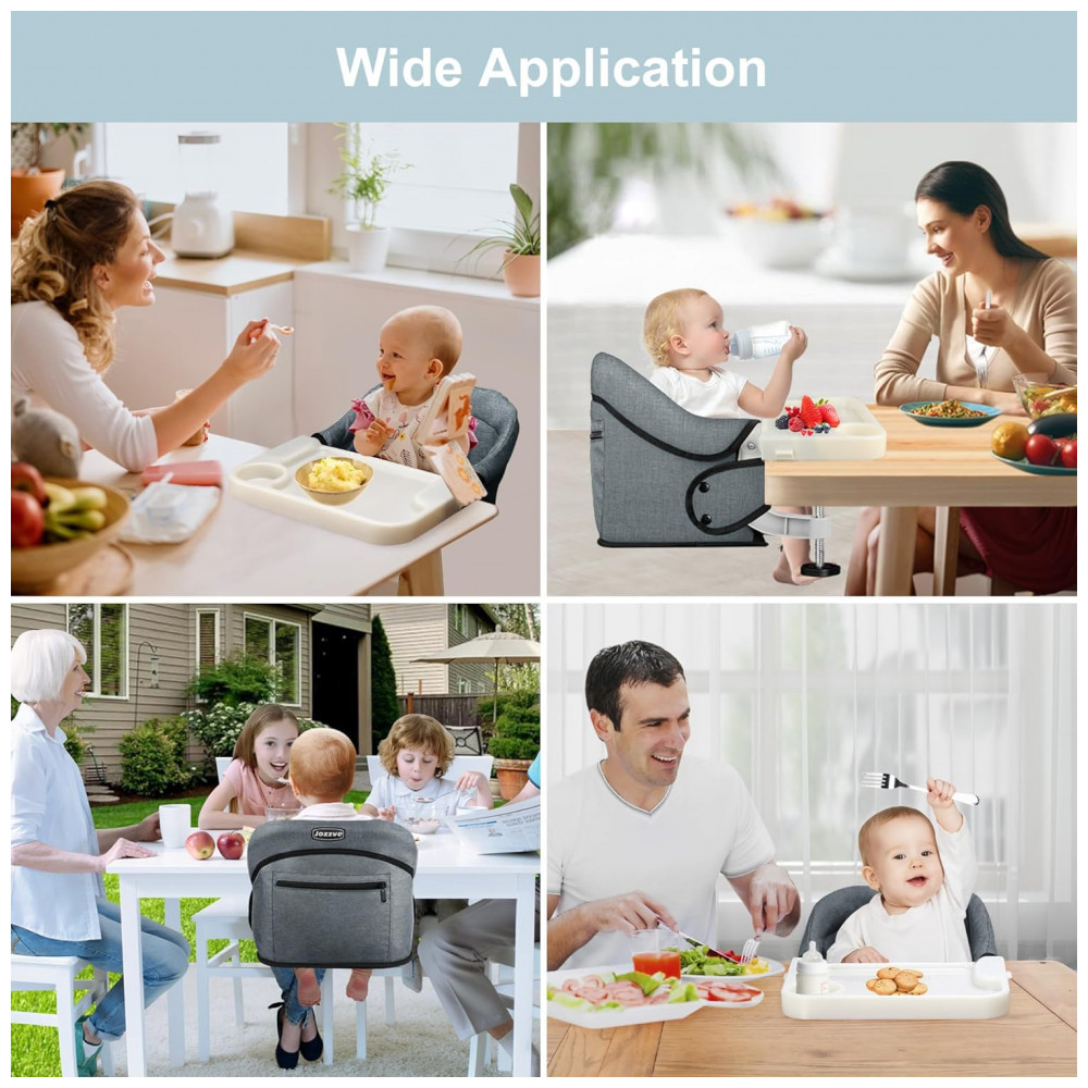 CADEIRA DE ALIMENTAÇÃO PARA BEBÊS RESISTENTE Esta cadeira alta de mesa portátil é feita de material macio, bem feita e costura reforçada. A capa do assento é fácil de lavar com pano úmido ou na água e secar. Bolso de zenamento com zíper na parte de trás para zenar babadores, utensílios e panos de lavagem facilmente