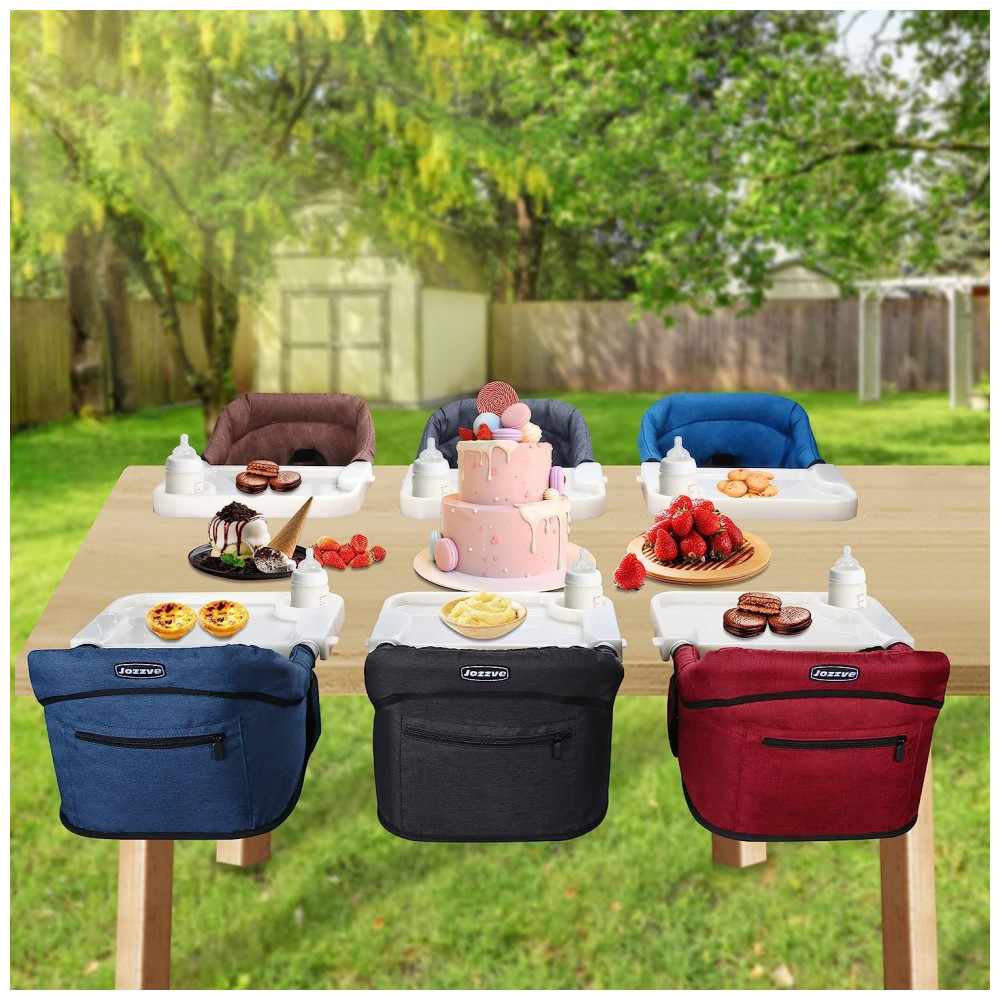GANCHO NA CADEIRA ALTA COM BANDEJA Este acessório para assento de mesa rápido é um design dobrável para viagens e ocupa muito menos espaço e pode ser zenado em qualquer lugar. Bandeja de alimentação removível com porta copos, protege a comida de cair nos móveis. Vem com uma bolsa de transporte, também conveniente para tirar.