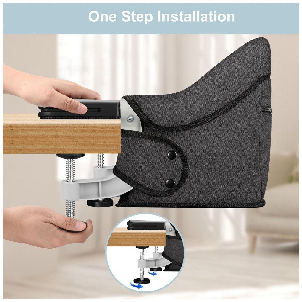 MONTAGEM E DESMONTAGEM RÁPIDA Instalação rápida e desmontagem em apenas 20s sem ferramentas para jantar em casa e em movimento, e a tampa do assento removível também pode ser limpa facilmente. Esta cadeira alta rápida é compatível com as mesas de jantar e bancadas mais pesadas e resistentes de 2 a de espessura. Dicas Meça primeiro a borda da mesa.