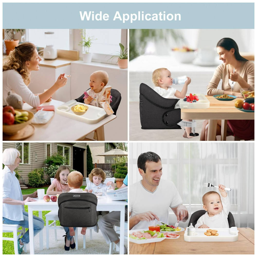 CADEIRA DE ALIMENTAÇÃO PARA BEBÊS RESISTENTE Esta cadeira alta de mesa portátil é feita de material macio, bem feita e costura reforçada. A capa do assento é fácil de lavar com pano úmido ou na água e secar. Bolso de zenamento com zíper na parte de trás para zenar babadores, utensílios e panos de lavagem facilmente