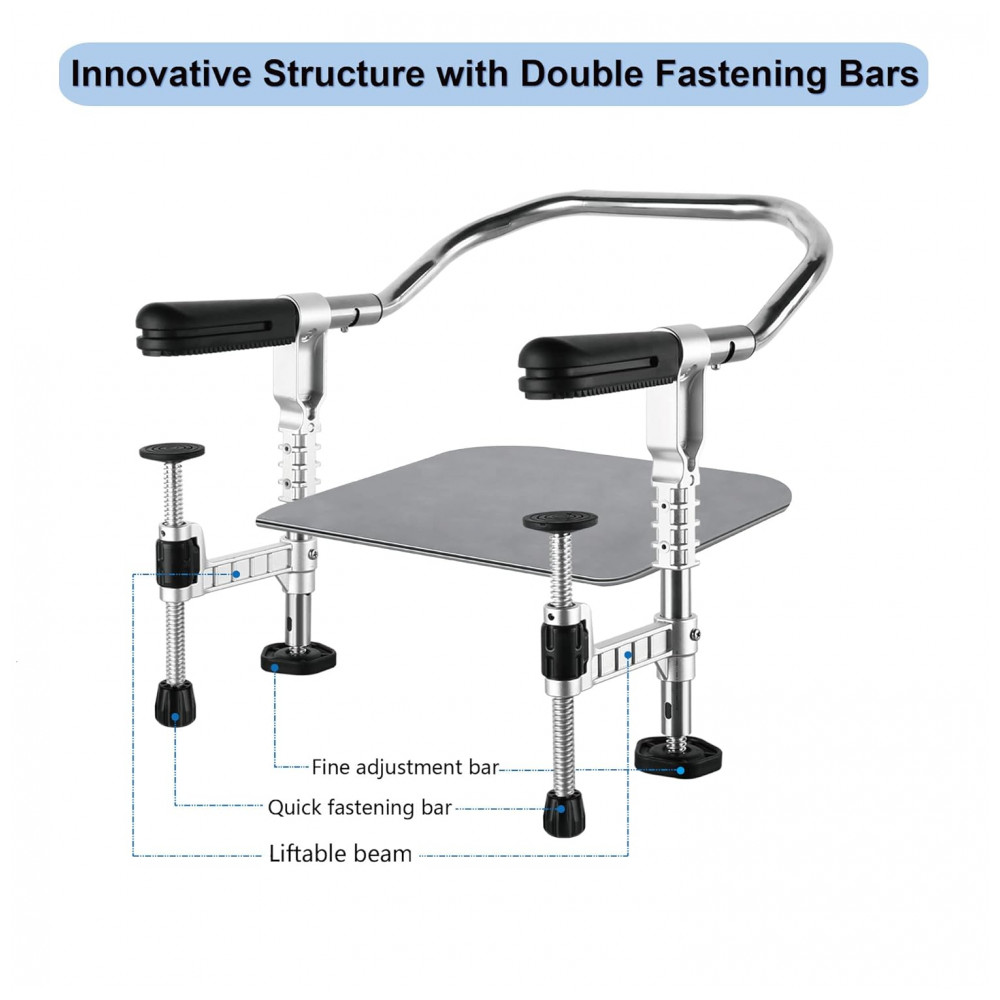 Rápido para instalar e remover As barras de fixação duplas, uma para travamento rápido e outra para ajuste fino. Você pode instalar rapidamente a cadeira de bebê na mesa e removê la rapidamente também.