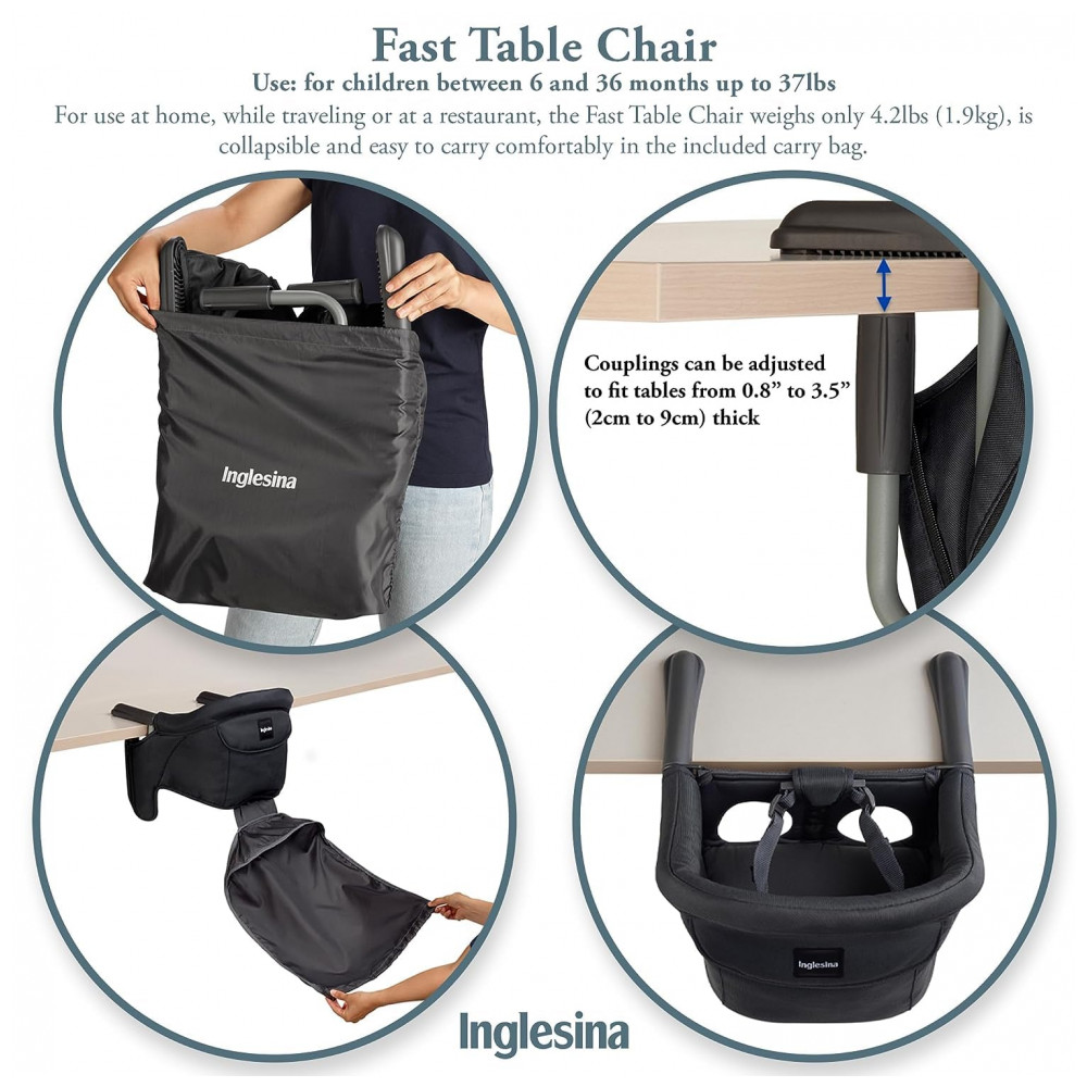 PORTÁTIL E DOBRÁVEL Completo com uma bolsa de transporte integrada para viagens e capacidade dobrável, a Fast Table Chair é fácil de embalar e sempre ao alcance para alimentar seu bebê com facilidade.