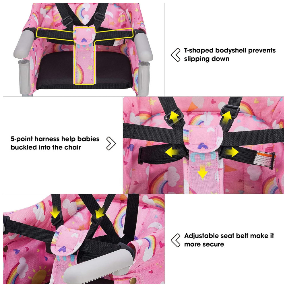 DETALHE DE SEGURANÇA O gancho portátil na cadeira pode segurar o bebê com pelo menos 6 meses de idade ou até 14 kg. Um arnês de segurança de 5 pontos pode evitar que o bebê fique de pé mesmo com o arnês travado, garante que seu bebê fique exatamente onde ele pertence.
