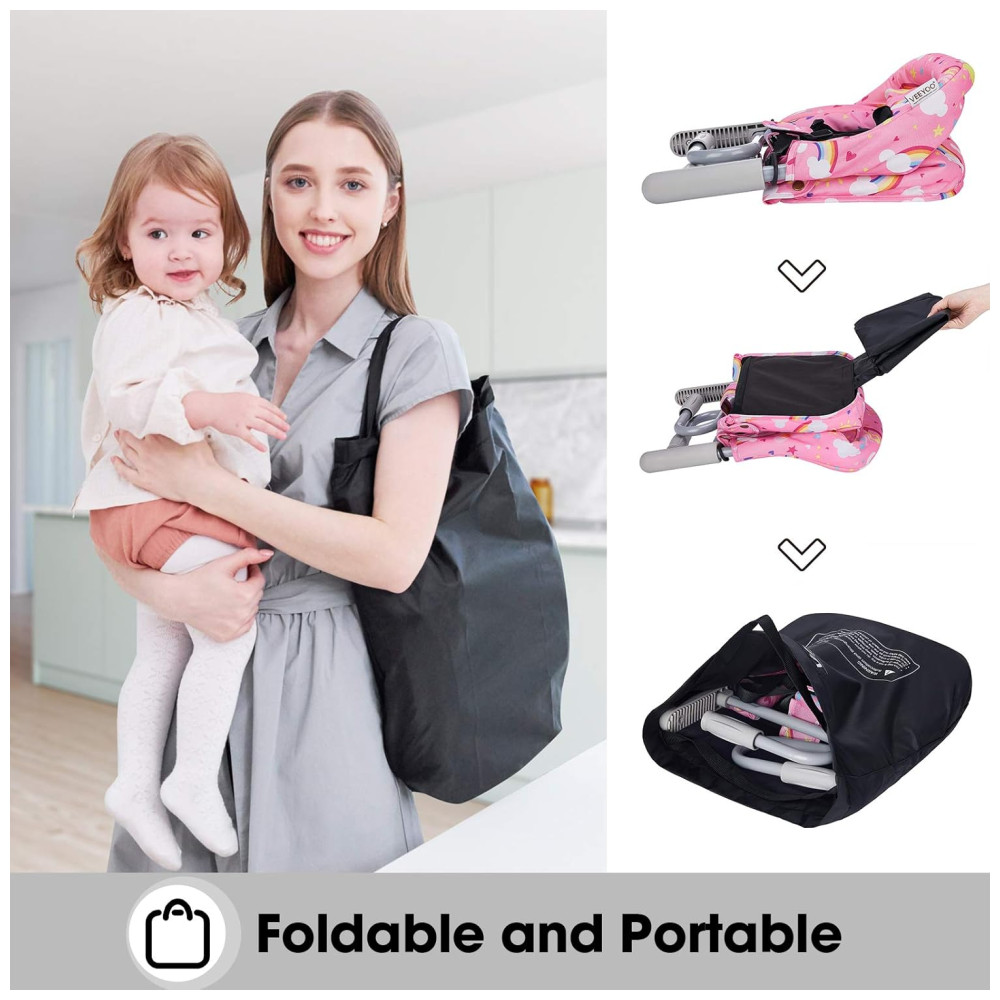 DESIGN CONVENIENTE O gancho VEEYOO na cadeira é leve e dobra se para uma viagem ou zenamento conveniente. A parte de trás da cadeira vem equipada com zenamento. Uma bolsa de transporte que você pode pendurar no ombro também está incluída nesta cadeira alta.