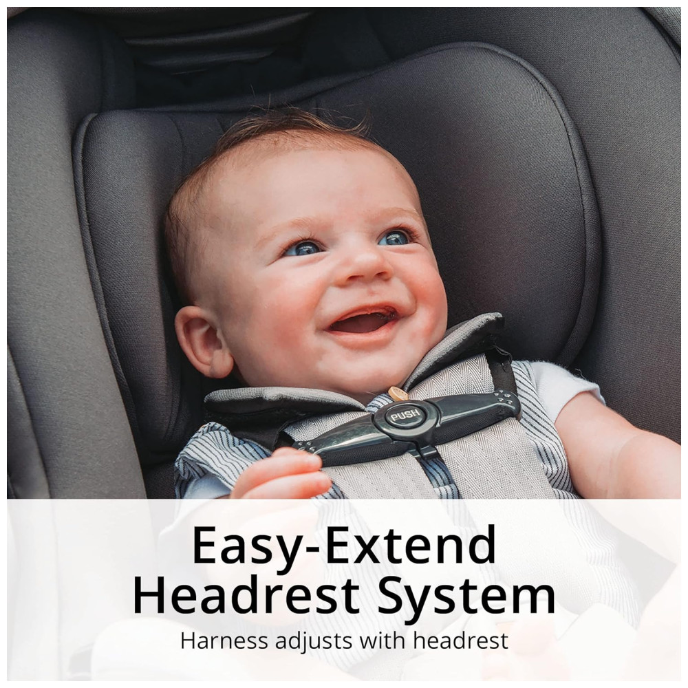 SISTEMA DE ENCOSTO DE CABEÇA DE FÁCIL AJUSTE – Maximize a segurança virada para trás com nosso sistema de encosto de cabeça de 5 posições, que eleva-se junto com o arnês. A barra anti-rebote integrada proporciona estabilidade adicional e espaço para as pernas, acompanhando o crescimento das crianças até 32” de altura.