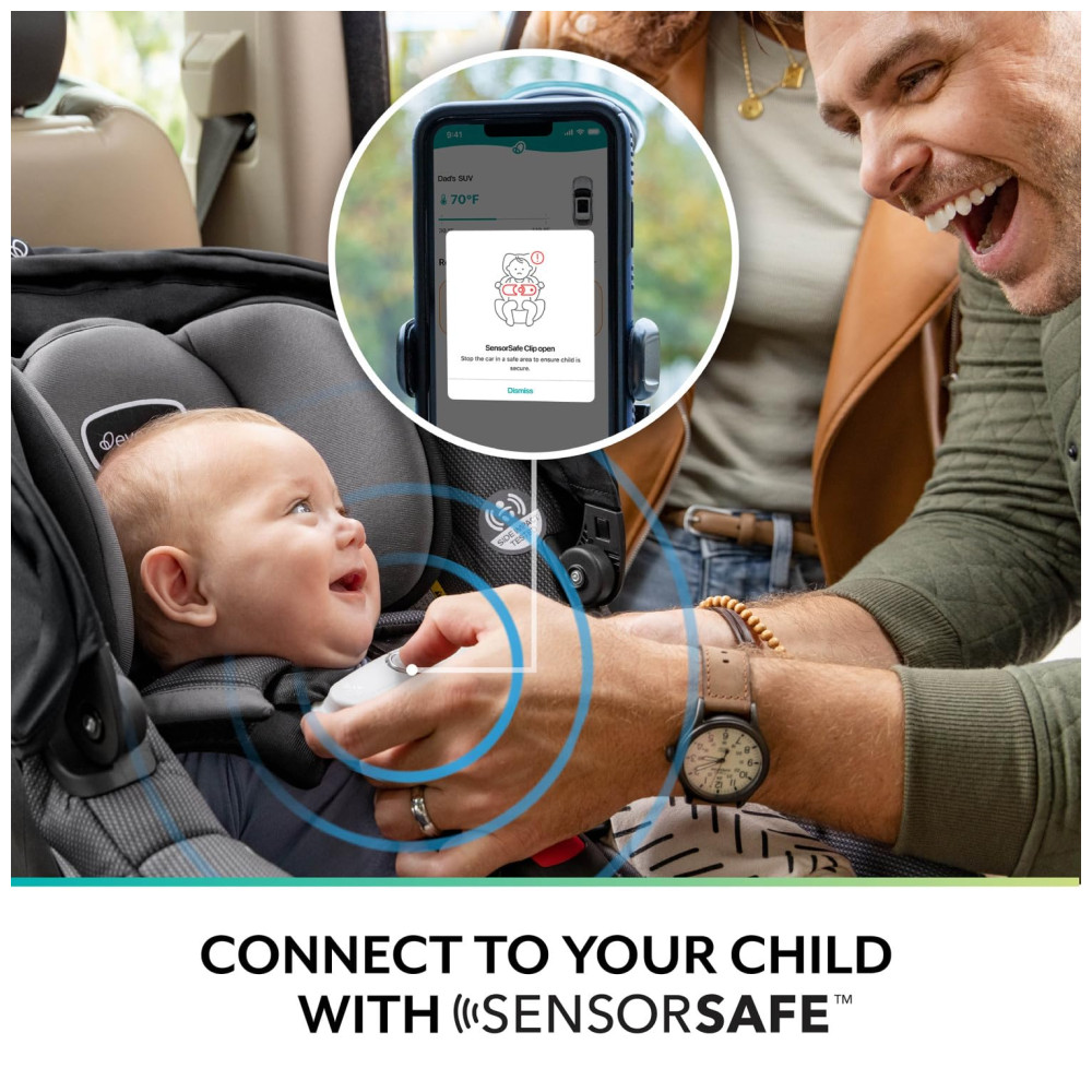 CONEXÃO COM SEU FILHO: A tecnologia Integrated SensorSafe alerta em tempo real sobre 4 condições potencialmente inseguras da cadeirinha do seu filho por meio de Bluetooth, incluindo o desdobramento inesperado do clipe no peito, temperatura perigosa no carro, criança desacompanhada no carro e tempo prolongado sentado.