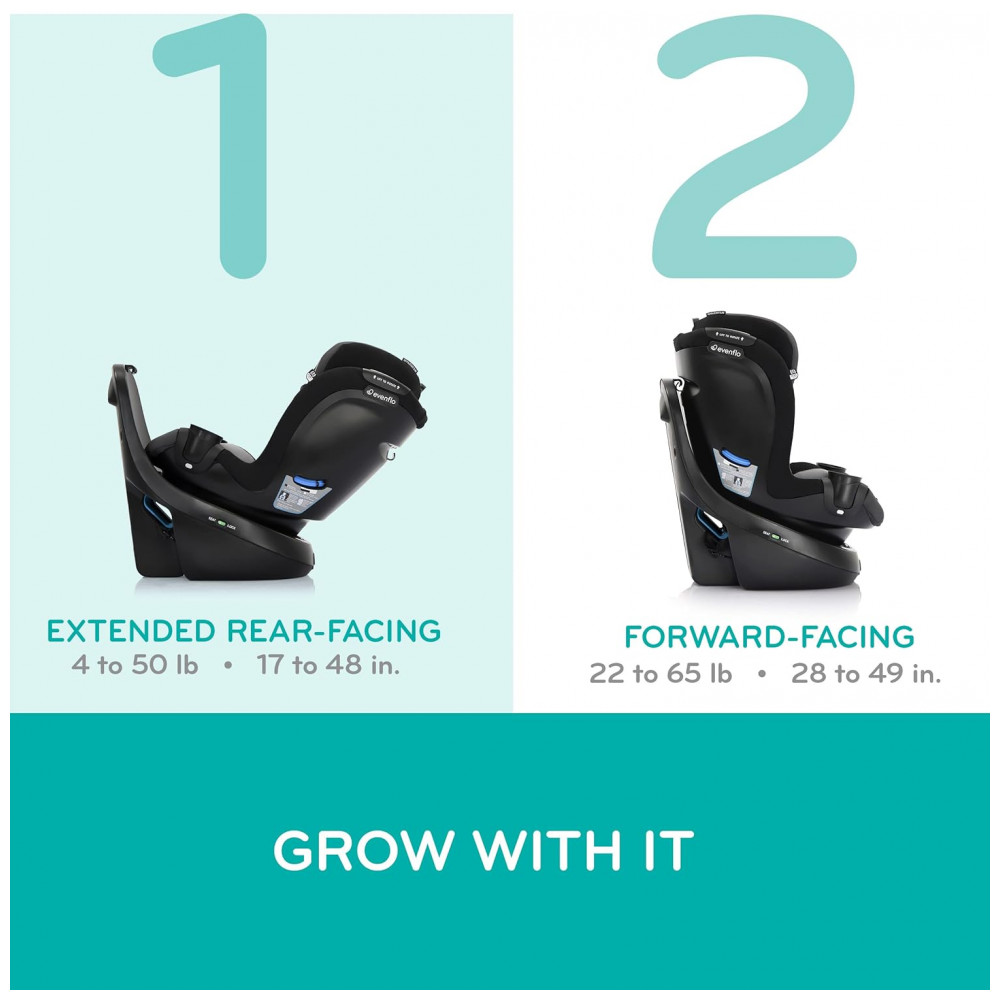 O assento é projetado para crescer com a criança, oferecendo o modo voltado para a retaguarda para crianças com peso entre 4 e 50 libras aproximadamente 1,8 a 22,7 kg e altura entre 17 a 48 polegadas aproximadamente 43,2 a 121,. Além disso, possui o modo voltado para a frente para crianças com peso entre 22 e 65 libras aproximadamente 10 a 29,5 kg e altura entre 28 a 49 polegadas aproximadamente 71,1 a 124,.