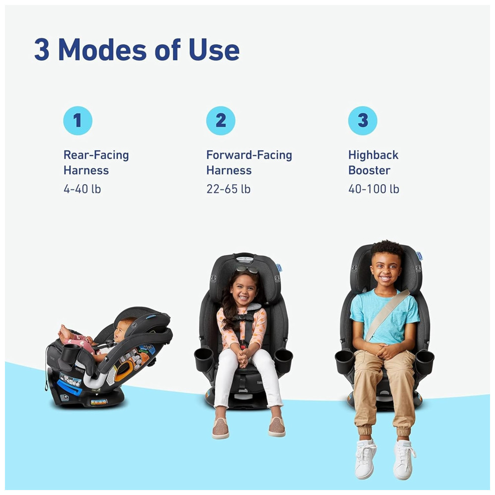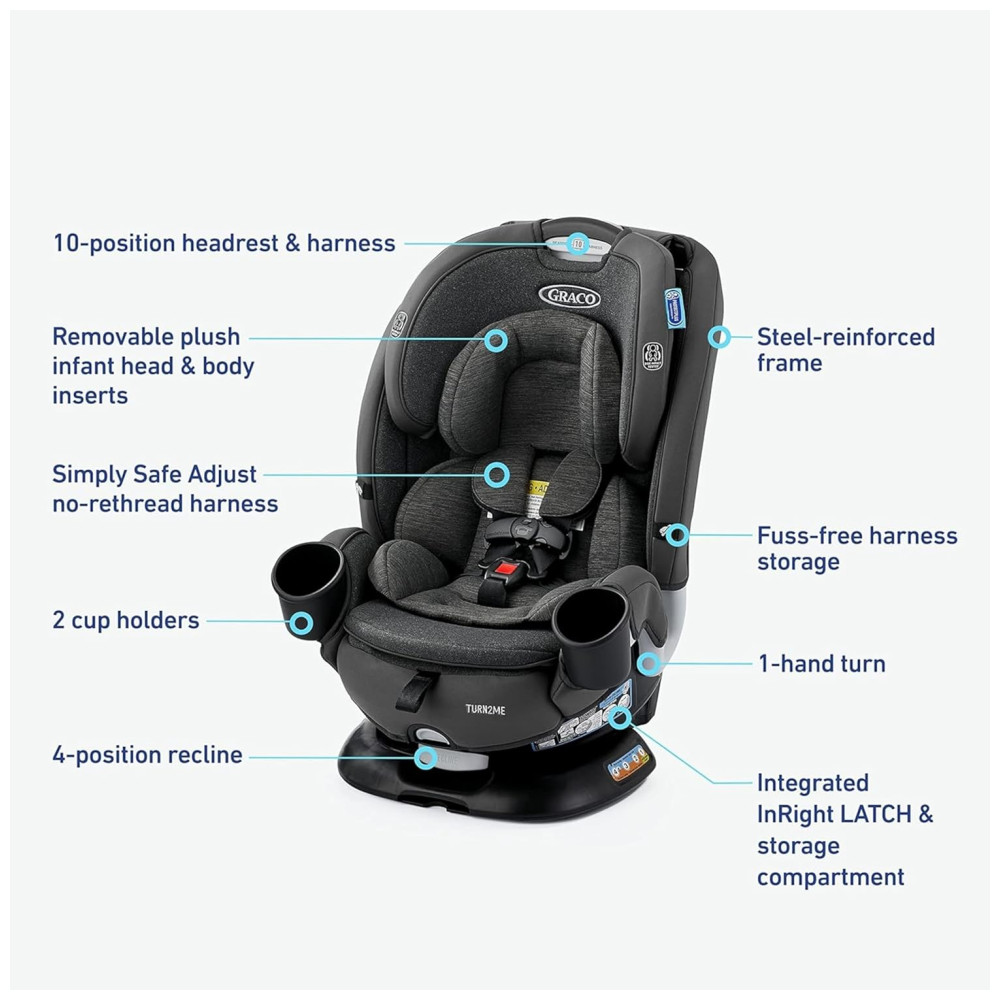 A cadeirinha de carro Graco Turn2Me 3 em 1 é uma solução versátil que proporciona conforto e segurança excepcionais para o seu filho, adaptando-se ao seu crescimento. Este modelo pode ser utilizado como arnês voltado para trás para recém-nascidos, arnês voltado para a frente e também como assento elevatório com encosto alto para crianças até 45,35 quilos.