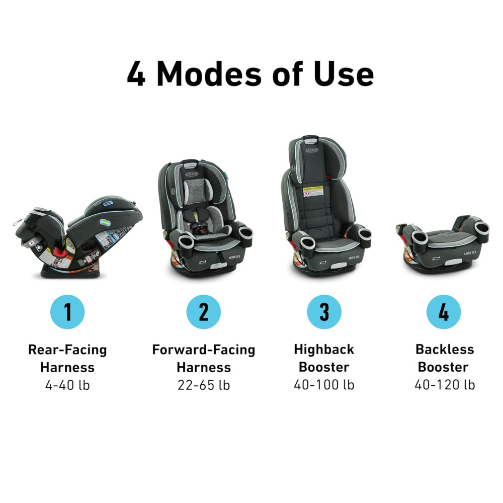 O assento para carro 4 em 1 oferece 10 anos de uso transforma se perfeitamente de assento de carro com arnês voltado para trás 1,8 kg a 18 kg, para assento de carro com arnês voltado para a frente 9 kg a 29 kg para reforço de posicionamento de cinto alto18 kg a 45 kg para reforço de posicionamento de cinto sem encosto 18 kg a 54 kg.