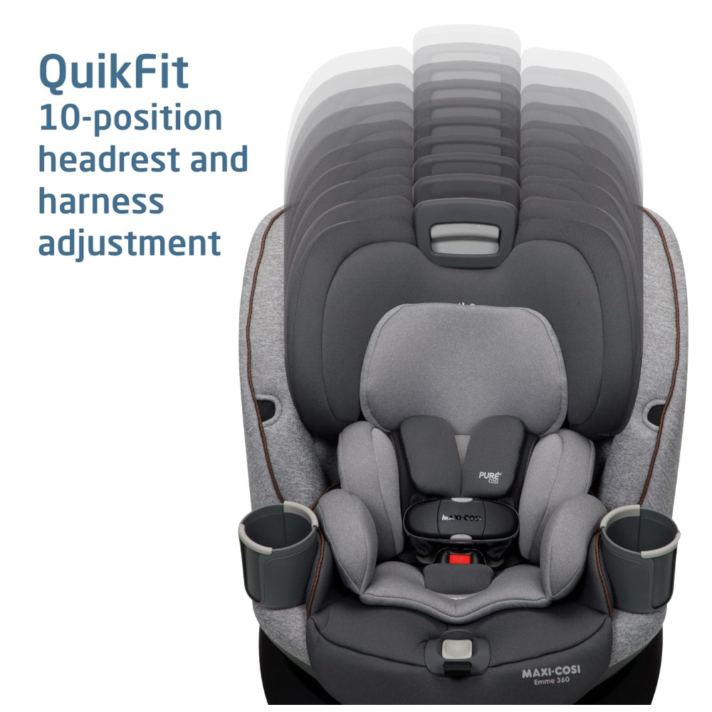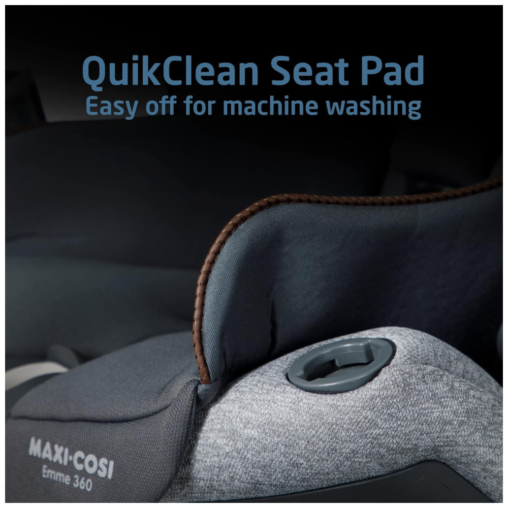 Apoiado desde o início com tecidos premium PureCosi, feitos sem lã ou tratamento retardador de fogo adicionado, os tecidos e almofadas são removíveis e laváveis à máquina. Projetado para conforto completo, o Emme 360 apresenta travesseiro e almofadas macios para a cabeça do bebê, ReclineFit com 5 posições reclinadas e recursos adicionais como clipe magnético de peito ClipQuik, apoio de cabeça e arnês QuikFit de 10 posições, almofada de assento removível QuikClean e suportes de arnês convenientes. Dois porta-copos removíveis e próprios para lava-louças oferecem praticidade adicional.