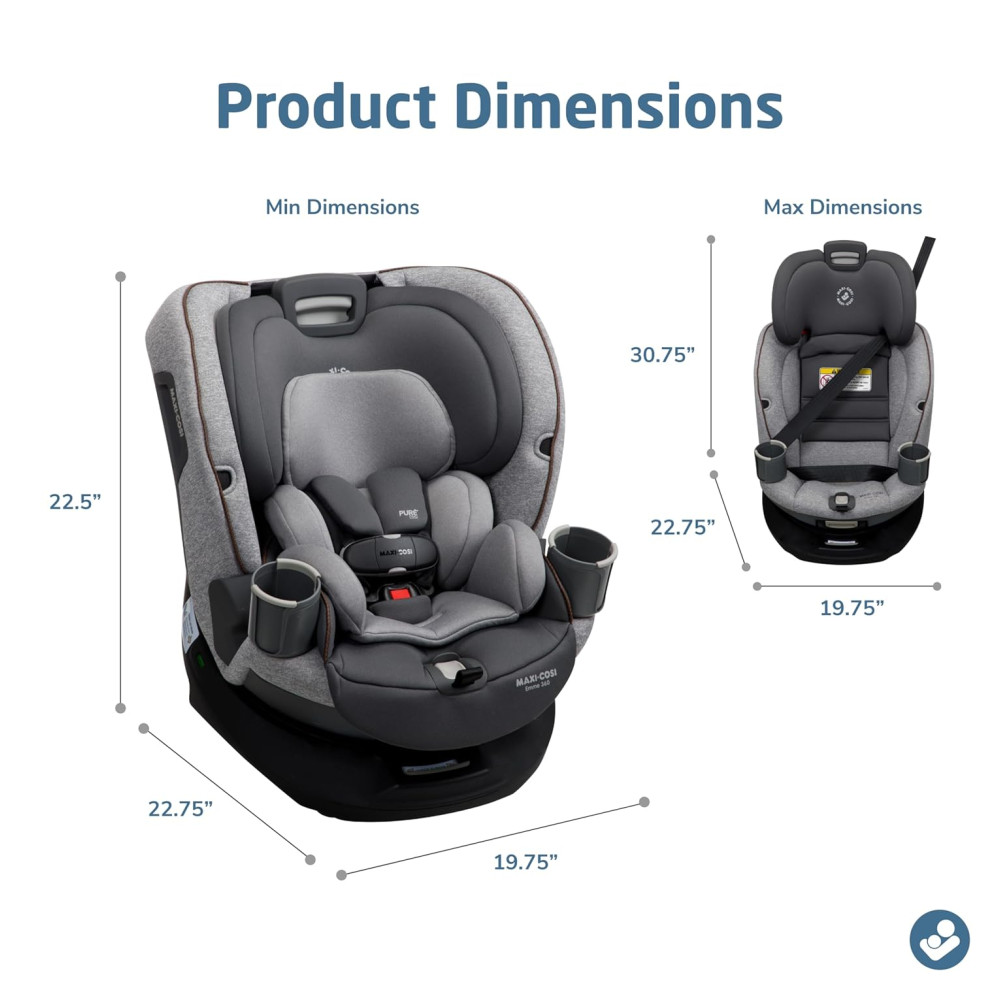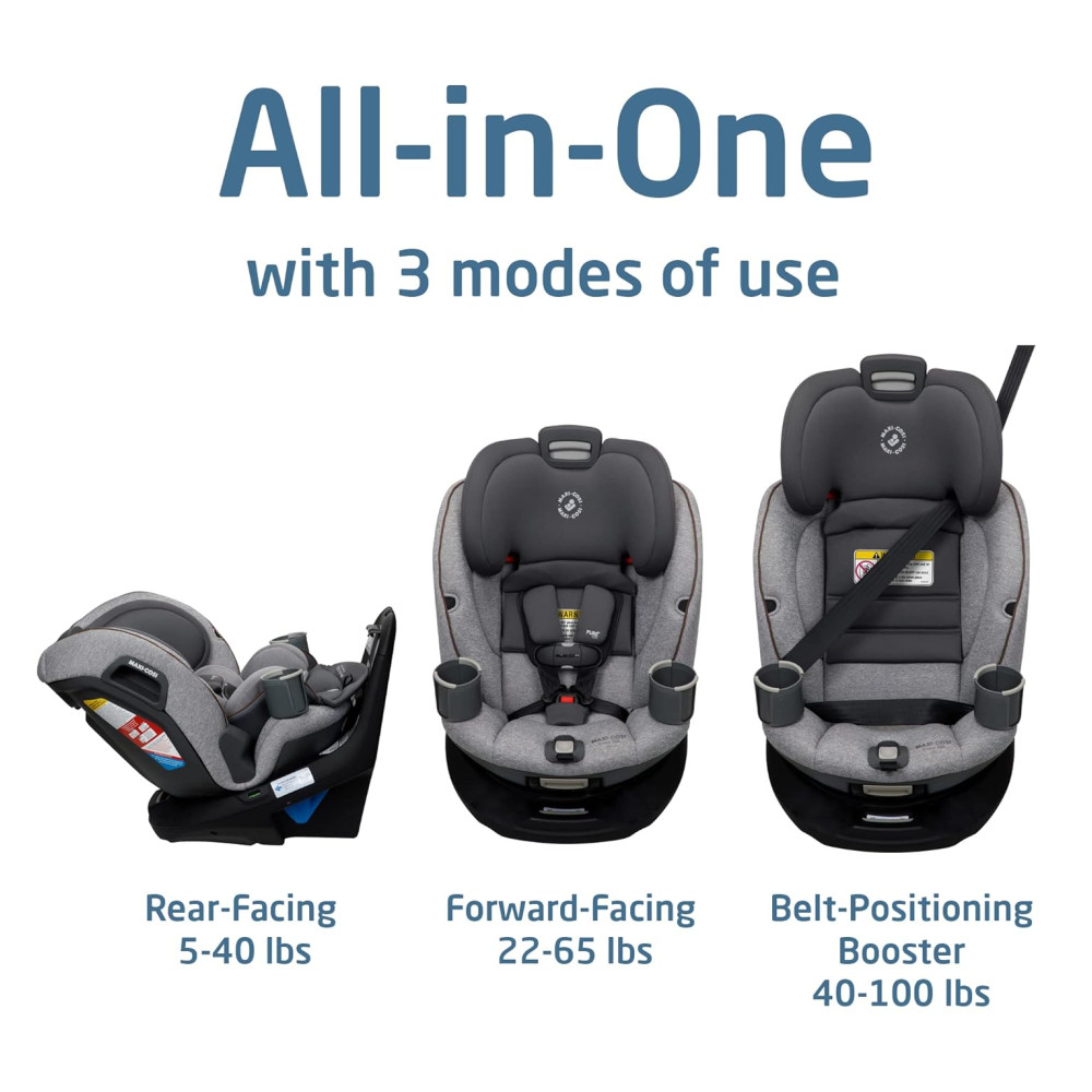 O Emme 360 evolui com seu filho, cobrindo todos os estágios de crescimento, desde o nascimento até os 10 anos, em três modos de uso: voltado para trás (2,27–18,14 kg, 48,26–101,6 cm), voltado para frente (10–29,48 kg, 73,66–124,46 cm) e posicionamento do cinto de reforço (18,14–45,36 kg, 109,22–132,08 cm).