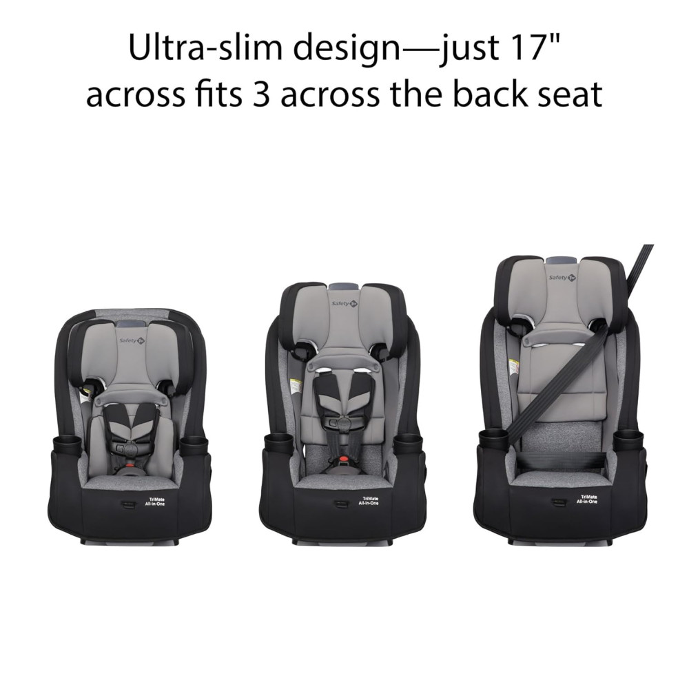 O design ultrafino do TriMate All in One Convertible Car Seat permite que os pais encaixem três no banco de trás sem sacrificar o conforto.