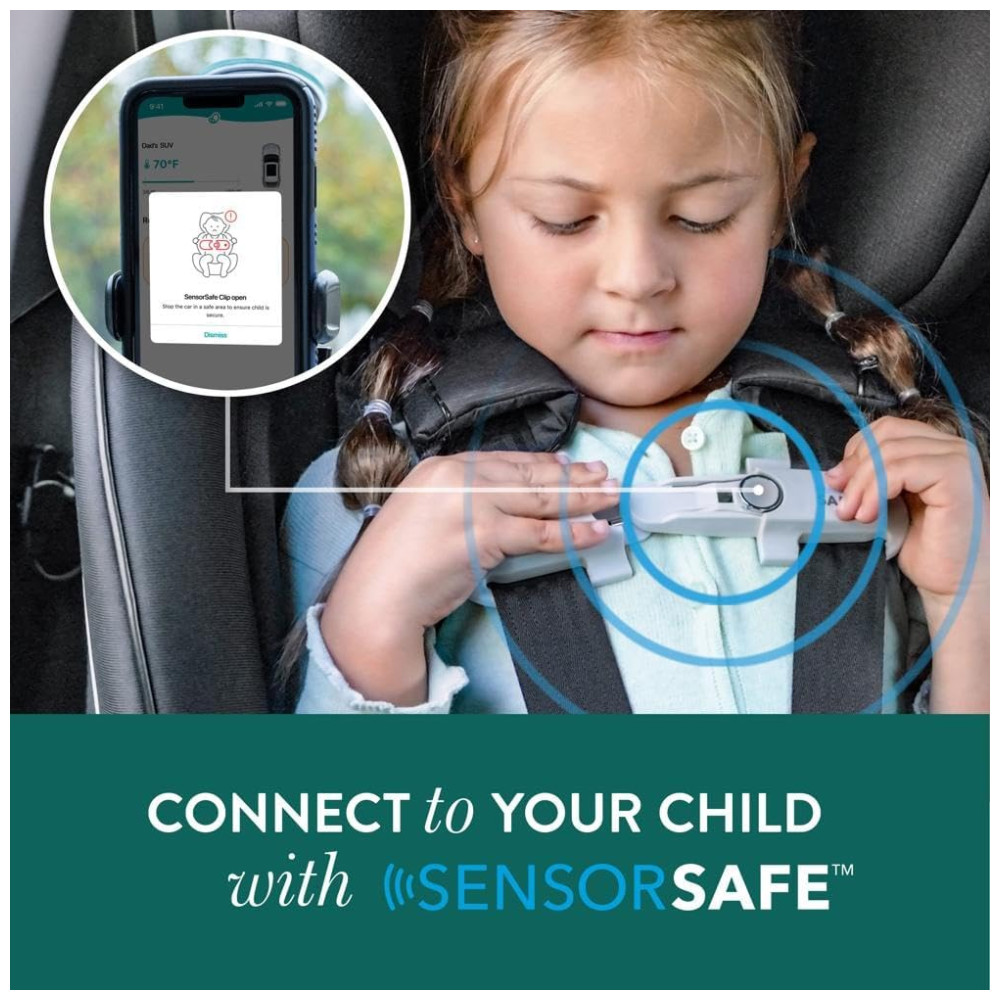 CONECTE-SE AO SEU FILHO COM SENSORSAFE: Fornece alertas em tempo real para quatro condições potencialmente inseguras da cadeirinha do seu filho – desaperto inesperado do clipe torácico, temperatura muito quente ou muito fria no carro, criança desacompanhada no carro e criança sentada por muito tempo.