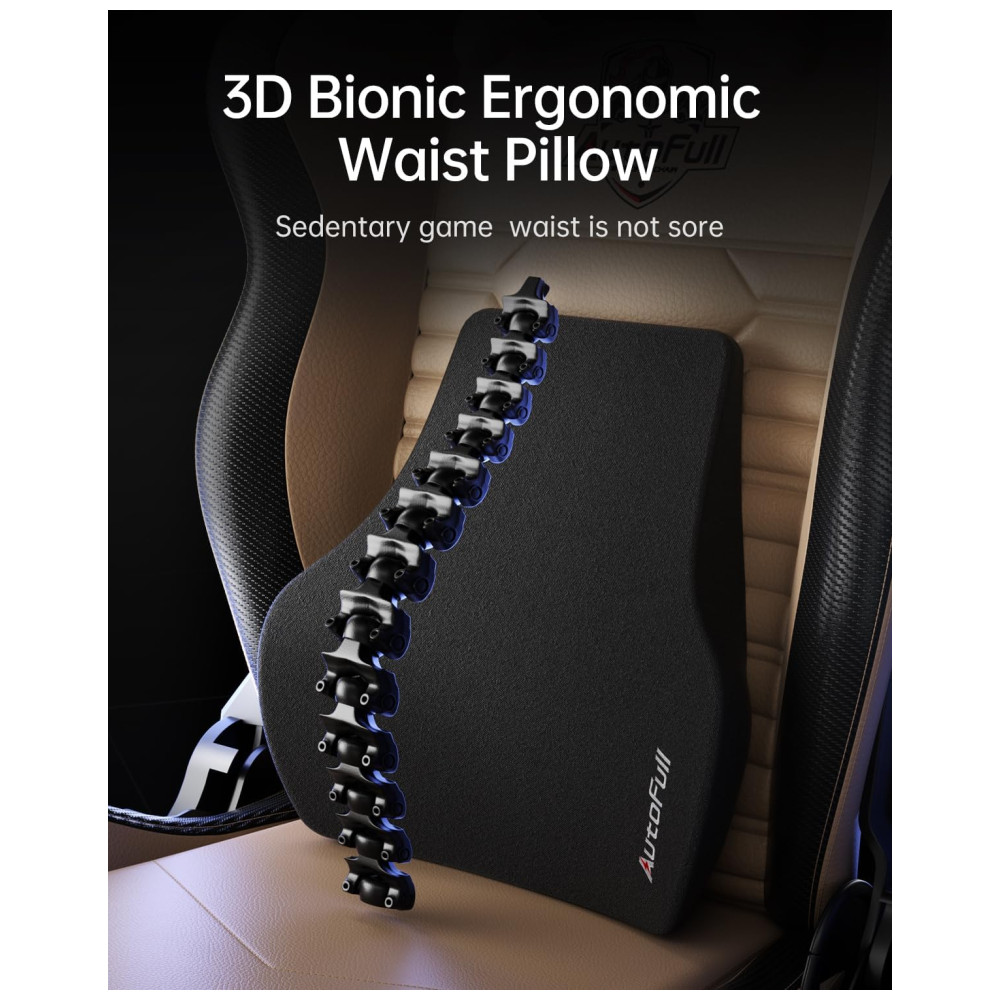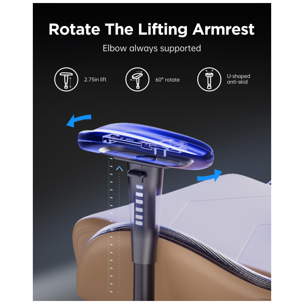 DESIGNERGONÔMICO Apoio de braço rotativo lateralmente em 45 e altura de ajustável, superfície ergonômica em forma de U envolta em PU macio, que suporta perfeitamente o cotovelo. Equipado com uma almofada lombar de modelagem biónica 3D, que se adapta à curva da coluna lombar e dá lhe um apoio mais abrangente para a sua cintura.