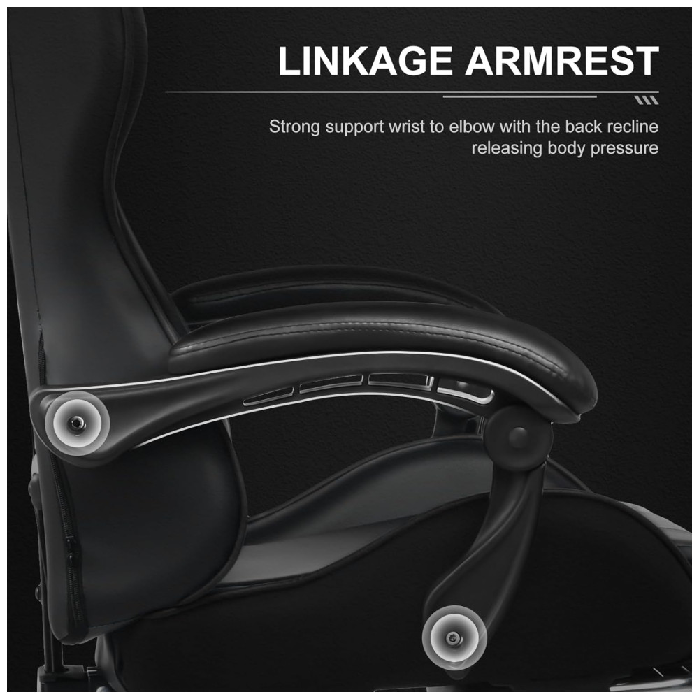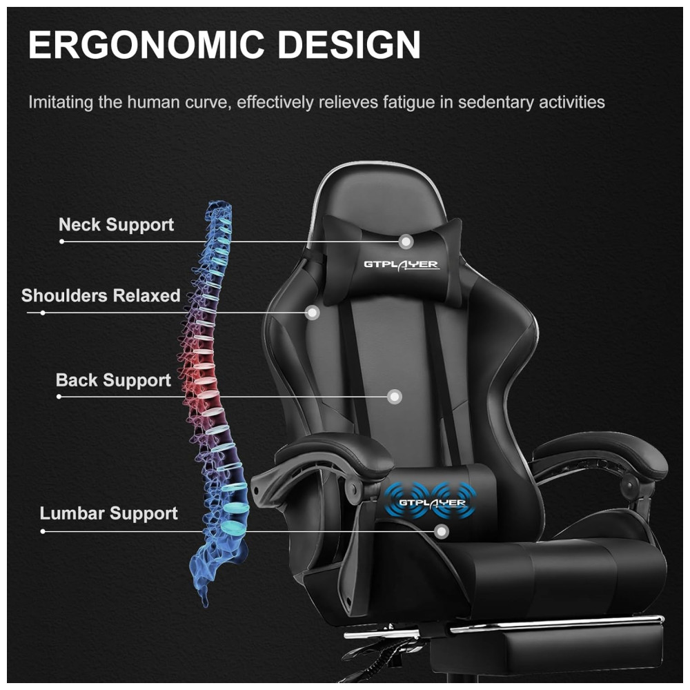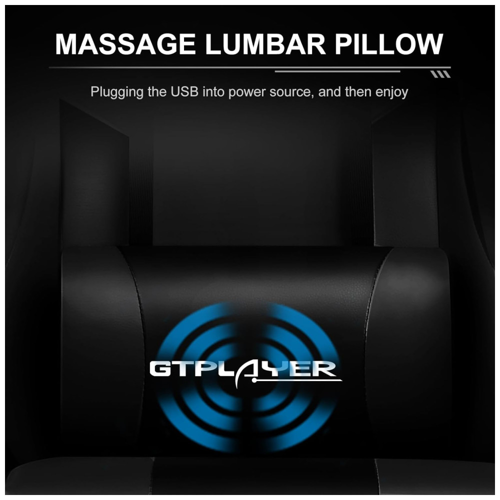 Mais confortável e relaxante Equipado com encosto de cabeça e almofada lombar de massagem. Quando sentir dores no pescoço por jogar ou trabalhar com a cabeça baixa por um longo tempo, o encosto de cabeça irá aliviar sua fadiga. recoste se e carregue a almofada da cintura, o bom parceiro massagear energicamente a sua cintura cansada.