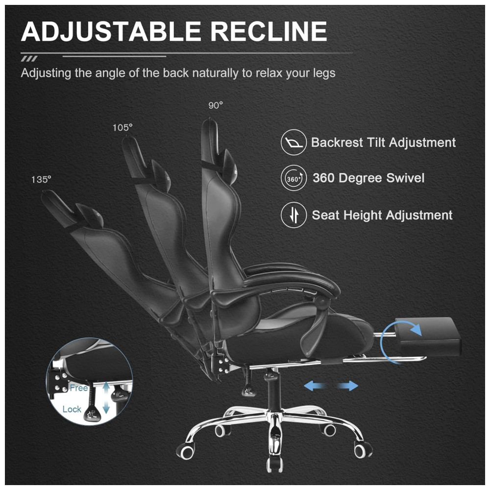 Liberte os pés Você se sentirá cansado por ficar sentado o tempo todo Claro. Então você pode escolher a cadeira com apoio para os pés para relaxar os pés. Quando não quiser endireitar as costas e sentar, basta retirar o apoio para os pés, coloque os pés para cima, ligue sua música favorita e comece a curtir o conforto E não se preocupe em limpar, também é feito de couro PU sintético de alta qualidade, basta passar um pano macio e ele vai brilhar como .