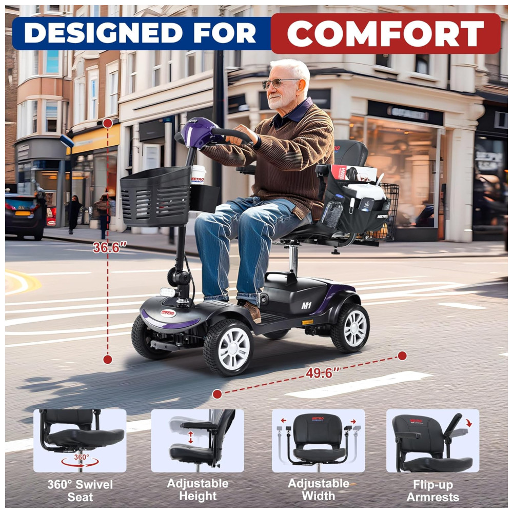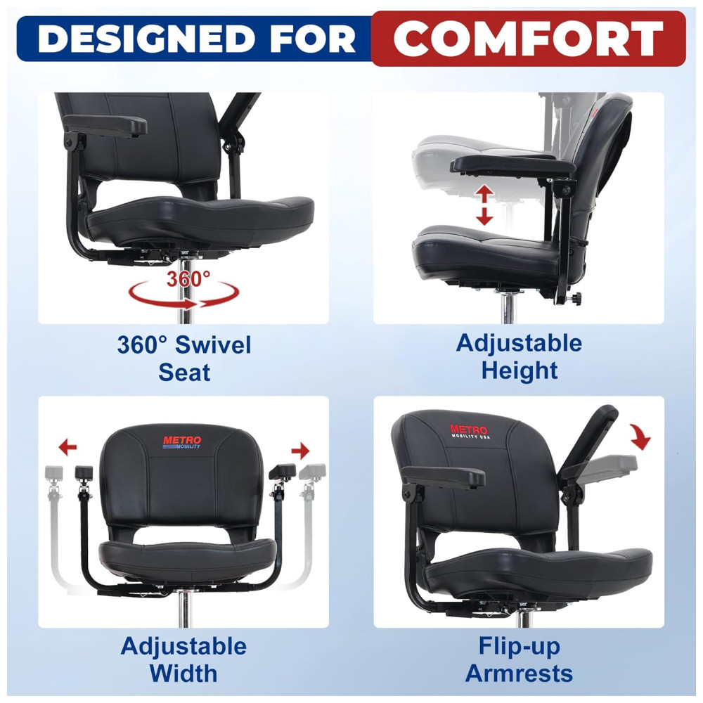 Conforto aprimorado – Pneus pneumáticos de 23 cm e suspensão a mola garantem um passeio suave, mesmo em terrenos irregulares. O assento giratório de 360° facilita a entrada e saída, e seu design ajustável oferece conforto personalizado e suporte ideal para as pernas.