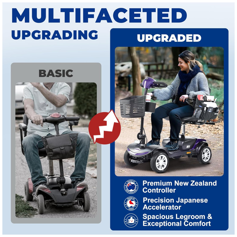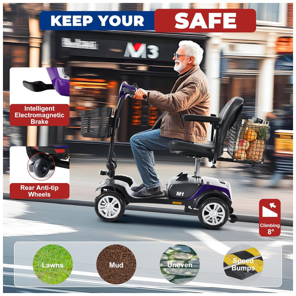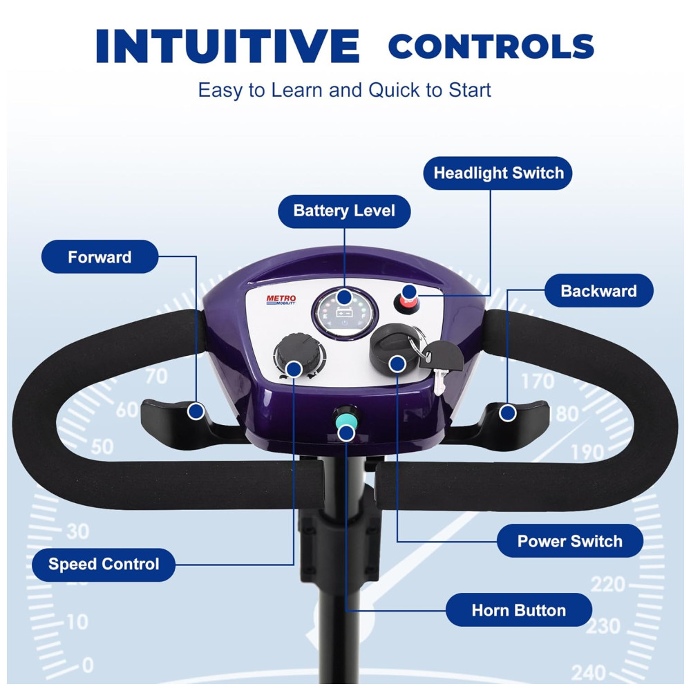 Operação fácil e segura – Equipado com faróis LED, luzes de freio, rodas anti-tombamento e tiras refletoras, garante segurança ao dirigir durante o dia ou à noite. O painel de controle ergonômico permite controle de uma mão, com ajuste de velocidade variável, botão de buzina e indicador de bateria.