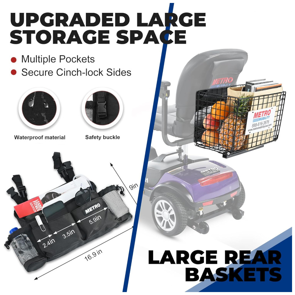 Espaço de armazenamento ampliado – A scooter possui uma cesta frontal, uma cesta traseira extra grande e uma bolsa lateral, proporcionando amplo espaço para itens essenciais de viagem, compras e uso diário.