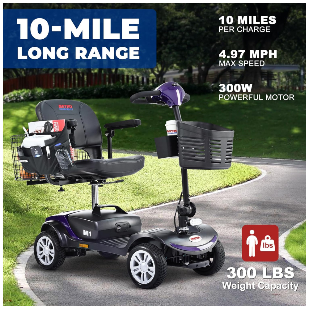 Parâmetros principais – Esta scooter motorizada suporta até 136 kg com motor de 300W e duas baterias de 12Ah, oferecendo autonomia de 16 km e velocidade máxima de 8 km/h. Possui raio de giro de 110 cm e capacidade de subida de 8°.