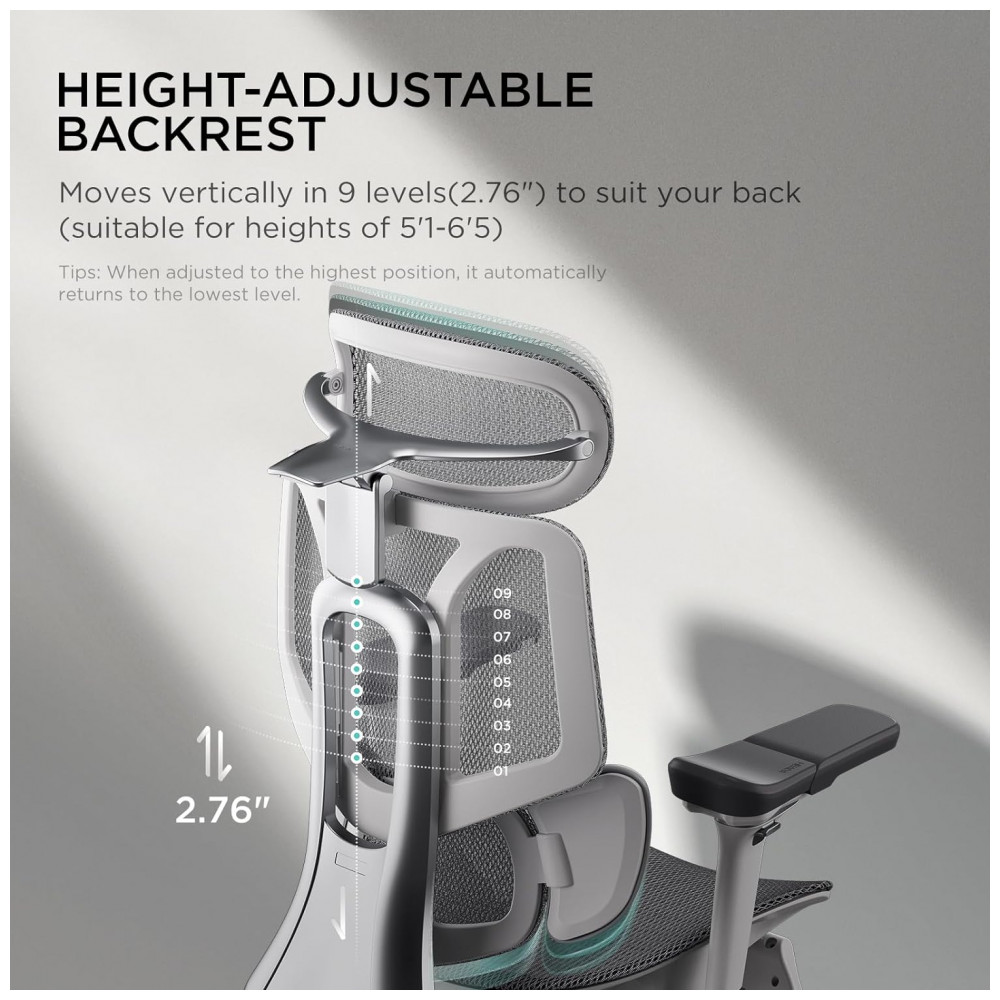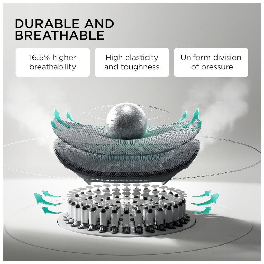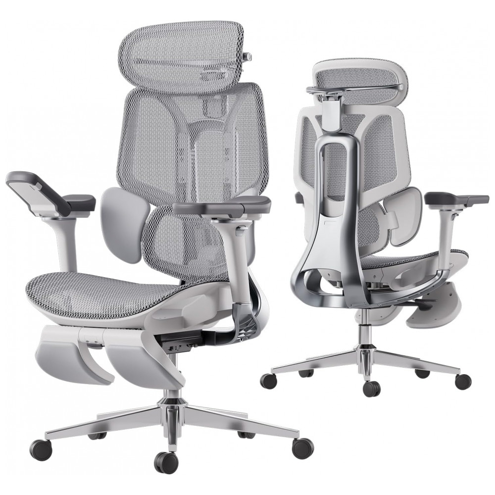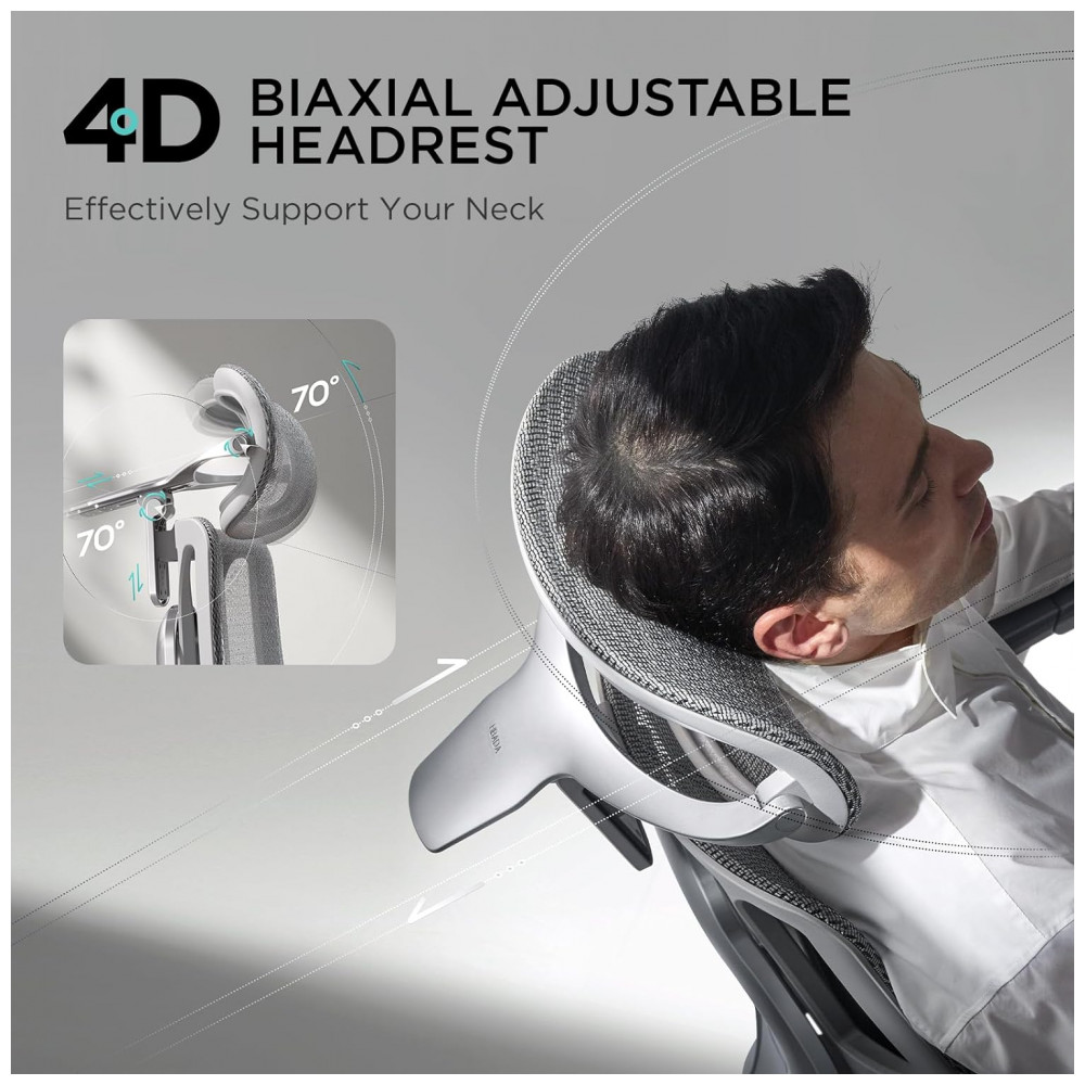 A cadeira ergonômica de escritório HBADA E3 Pro conta com apoio lombar elástico em 3 zonas com 8 ajustes precisos, incluindo avanço/recuo de 2,5 cm, elevação de 4 cm, inclinação dinâmica de 14° e rotação das asas em até 40° interna/externa para configuração adaptativa. O encosto de cabeça 4D biaxial permite regulagens em altura de 4,5 cm, avanço/recuo de 5,5 cm, rotação de 70° e sincronização com o encosto, mantendo estabilidade em movimentos.