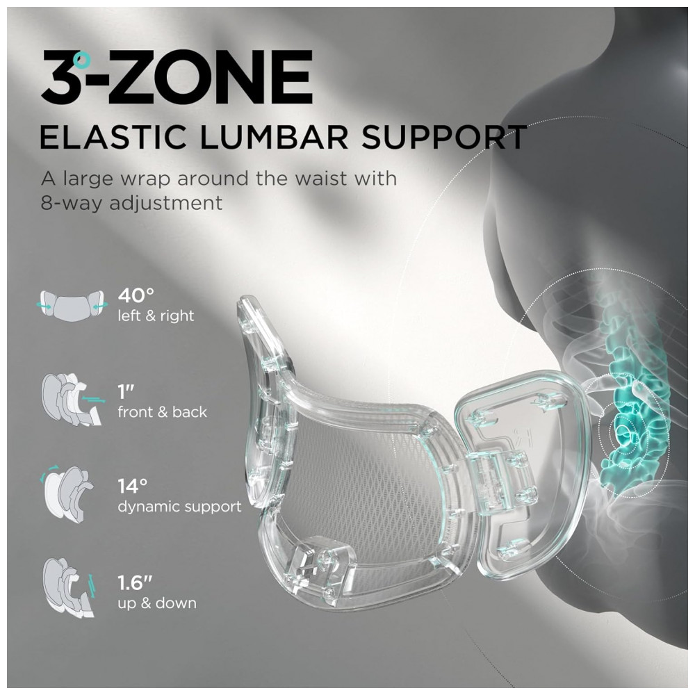 Apoio lombar elástico 3 zonas com 8D ajustes (avanço/recuo 2,5 cm, altura 4 cm, inclinação 14°, rotação 40°)
